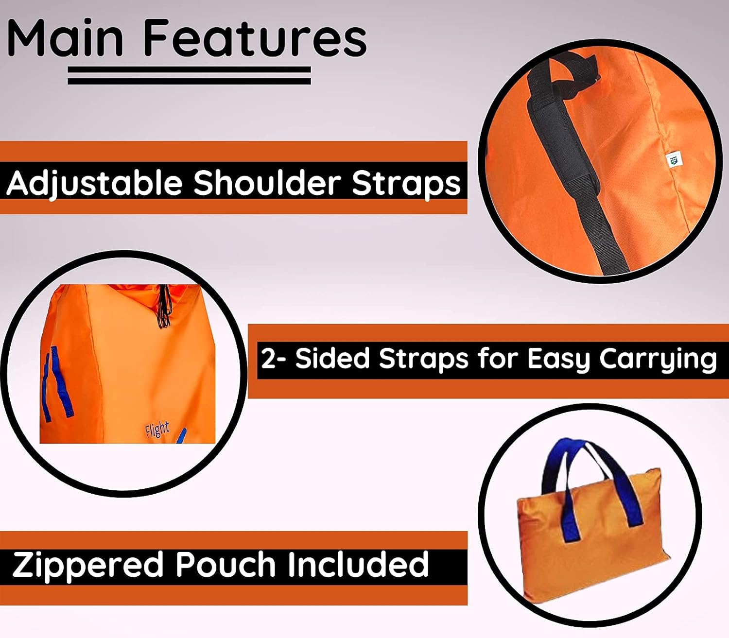 - BRIGHT ORANGE AND EASY TO SPOT - this bag universally fits most single, double and jogger strollers. This bag measures 48" x high X 25" wide X 17" deep. It helps to protect contents from dirt and damage. It is essential for travel. . Folds up into a handy travel pouch. Easy to slip into your handbag or hand baggage when not in use. Experience will tell you weight is everything when traveling - Avoid bulky or padded wheelie stroller travel bags
