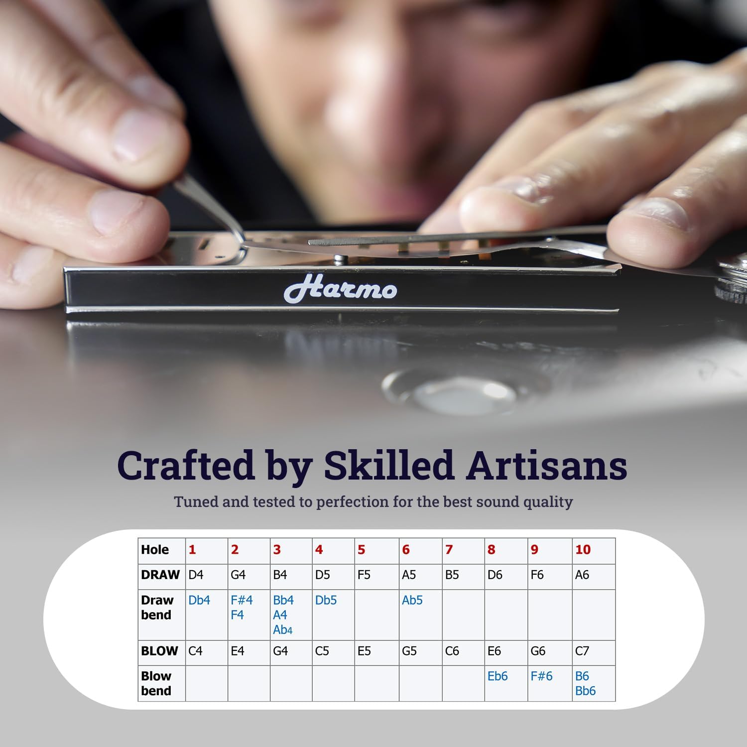 - RICH & EXPRESSIVE NOTES: Experience the pure melody of Harmo professional harmonica, precisely tuned using the well-regarded Richter Tuning across 10 holes. Its easy blow and draw actions unleash the major scale notes (F#, G#, A#, B, C#, D#, E#), enabling the composition of both whimsical tunes and professional melodies with ease.