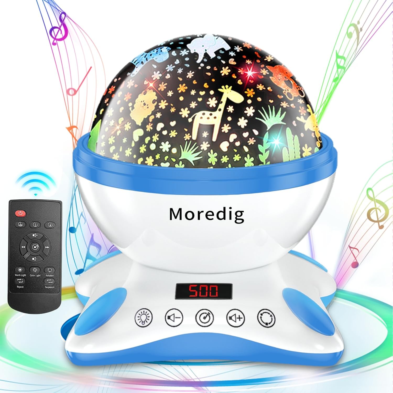 - Good Night's Sleep - Rotating function of baby night light for nursery enables cute images to move on the ceiling or wall. With 12 different styles of soft music, you can switch the song, volume level and play mode by remote control, which can be used with the kids projector night light mode to fall asleep peacefully. Moredig night lights for kids room helps kids overcome the anxiety brought by independence, but also help parents reduce the trouble of putting to bed