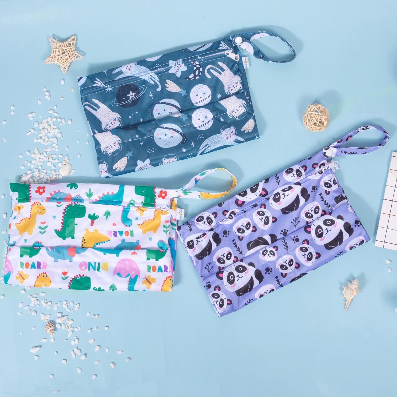 - Double-Pocket Design with Snap Handle: Each wet bag contains two pockets, which comes with two zip closures to ensure that nothing will drop out of the bag and better to keep the clean and dirty items separately. With the snap handle design, you can unbutton the haddle and easily hang the bag on the stroller or door knobs, towel rod ect. anywhere you want.