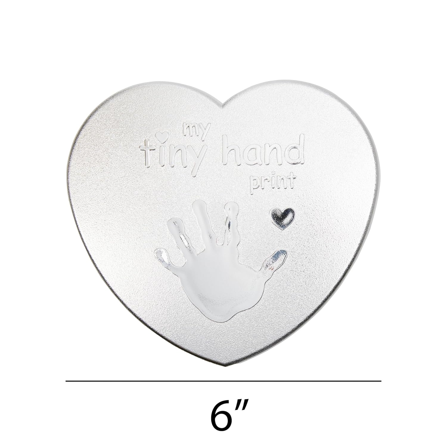 - Baby hand and footprint mold packaged in a darling plastic heart container that reads "My Tiny Hand Print" and measures 6.5" W x 6.25" L.