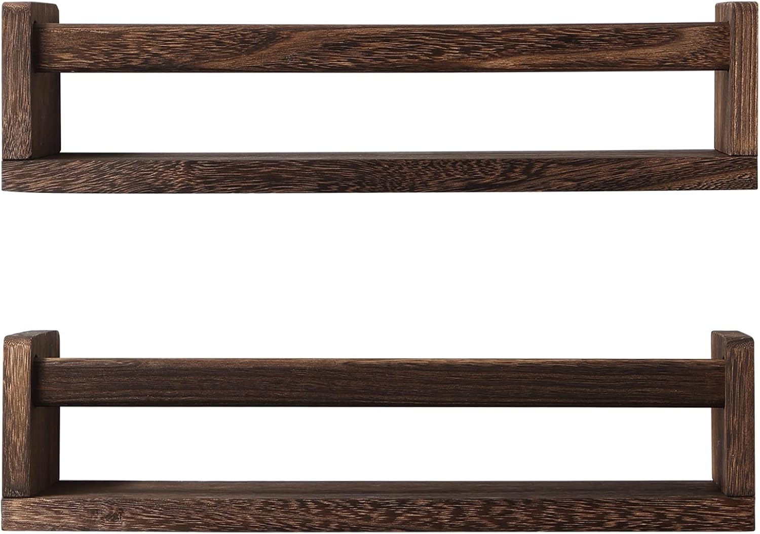 Nursery Book Shelves, Set of 2 Wood Floating Book Shelves for Kids Room, Kitchen Spice Rack, or Rustic Wall Mounted Shelves for Farmhouse Bathroom Decor (Carbon Brown)