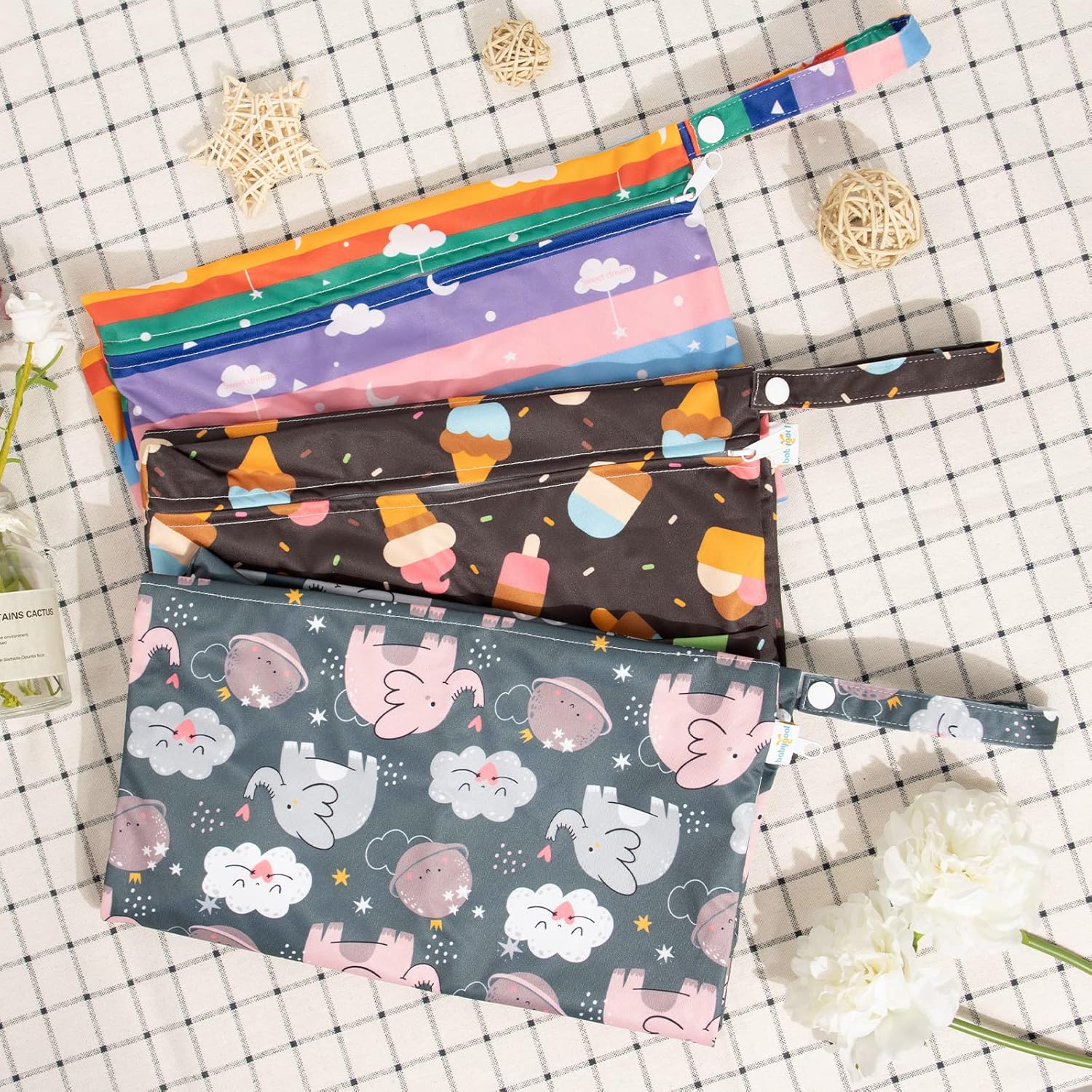 - Double-Pocket Design with Snap Handle: Each wet bag contains two pockets, which comes with two zip closures to ensure that nothing will drop out of the bag and better to keep the clean and dirty items separately. With the snap handle design, you can unbutton the haddle and easily hang the bag on the stroller or door knobs, towel rod ect. anywhere you want.
