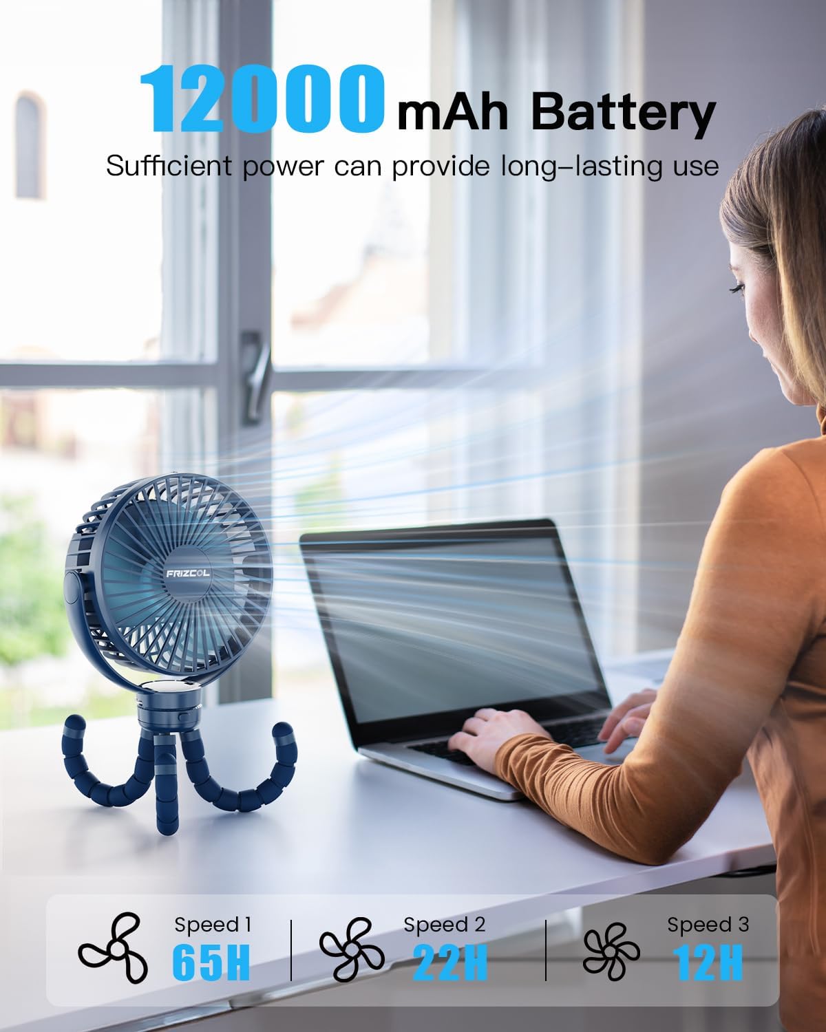 FRIZCOL 12000mAh Portable Stroller Fan, Use As Power Bank, 65H Battery Operated Fan Flexible Tripod Clip On Fans, Detachable Personal Handheld Baby Fans for Stroller, Car seat, Desk, Treadmill (Blue)