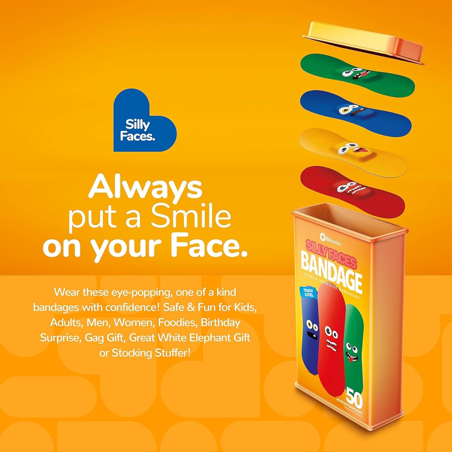 - SILLY FACES BANDAGES: This 50 piece tin of funny face bandages is great for putting a smile on kids' faces while protecting wounds such as cuts, scrapes, and burns, and come in 4 assorted styles; sticky bandages are perfect for kids and adults alike, and also for school nurses and pediatric doctors