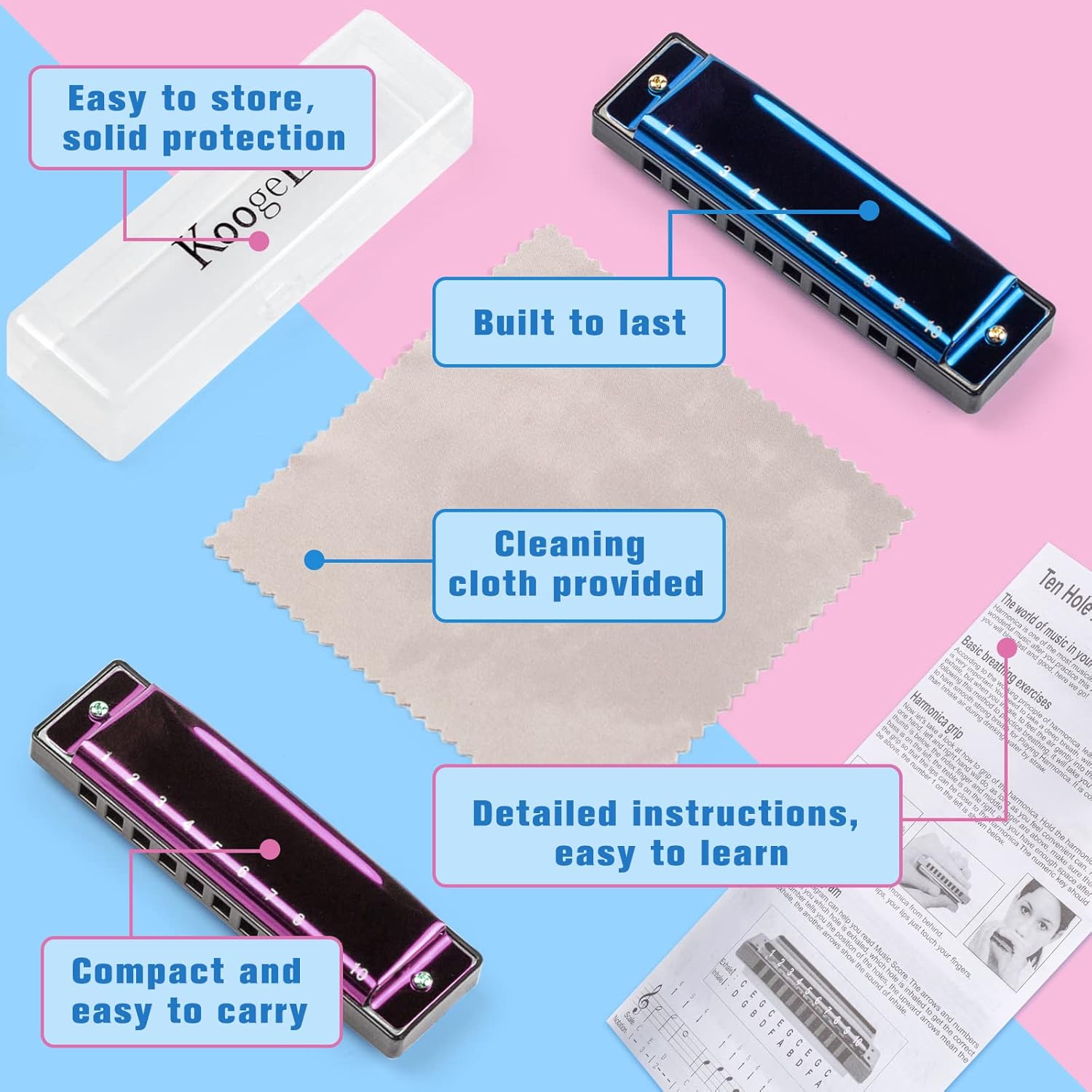 - Super Value Pack - You will receive 2PCS 10-hole harmonicas (one in pink and another is in blue, 4x0.8inches for each). Paired with sturdy storage boxes and cleaning cloth, as well as detailed user instructions.