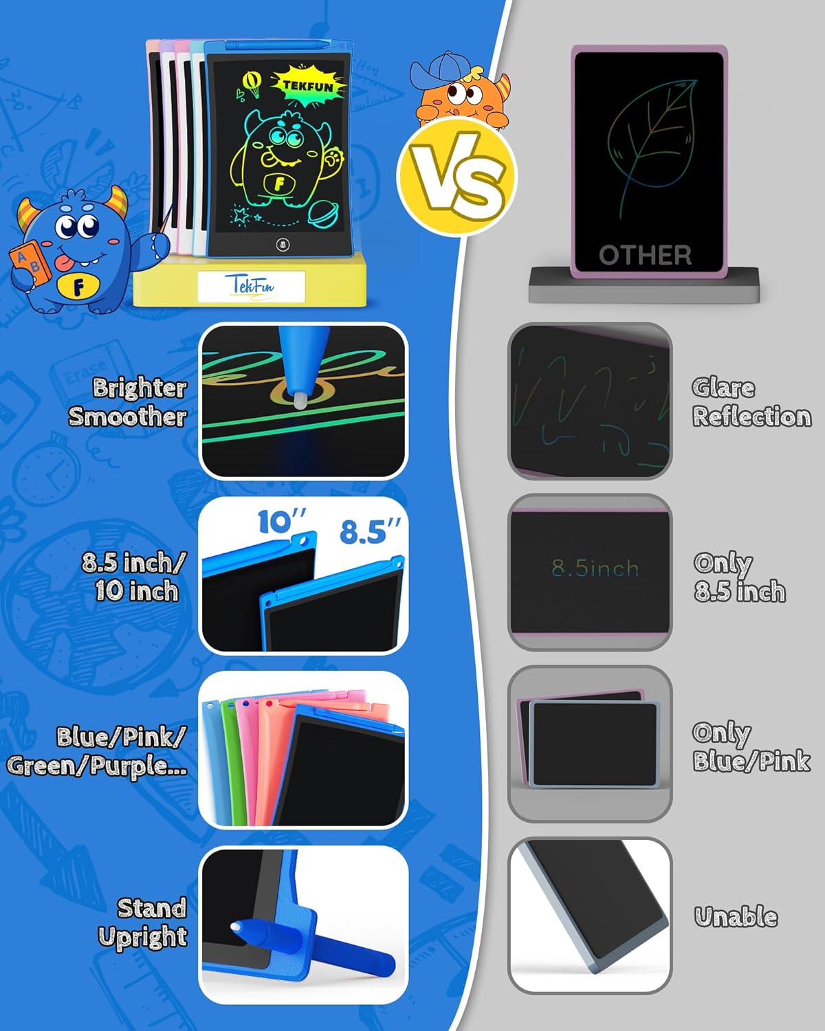 - Eye-protecting Colorful Screen: Eyes Are The Window To The Soul. Too much screen time on electronics will hurt kids' eyesight. The TEKFUN doodle board LCD screen with no blue light, no glare, radiation-free, but can depict a dreamy and colorful world and writes in "rainbow". Eyes will not be tired at all even for long-time use.