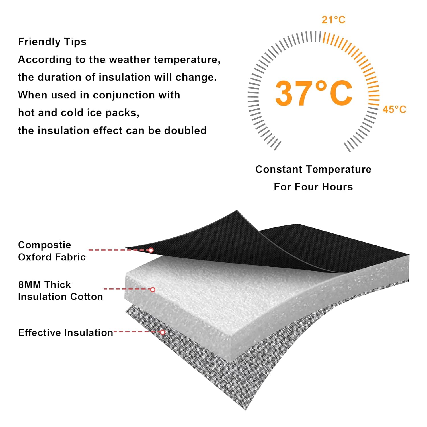 - HIGH QUALITY MATERIALS: Made of high quality water-resistant composite oxford fabric, 8mm extra-thick EPE foam and food-grade aluminum foil liner. No odor, non-toxic, food safe, durable, lightweight. Effectively keep bottles stay cold, warm or fresh for hours, it keeps breast milk fresh.