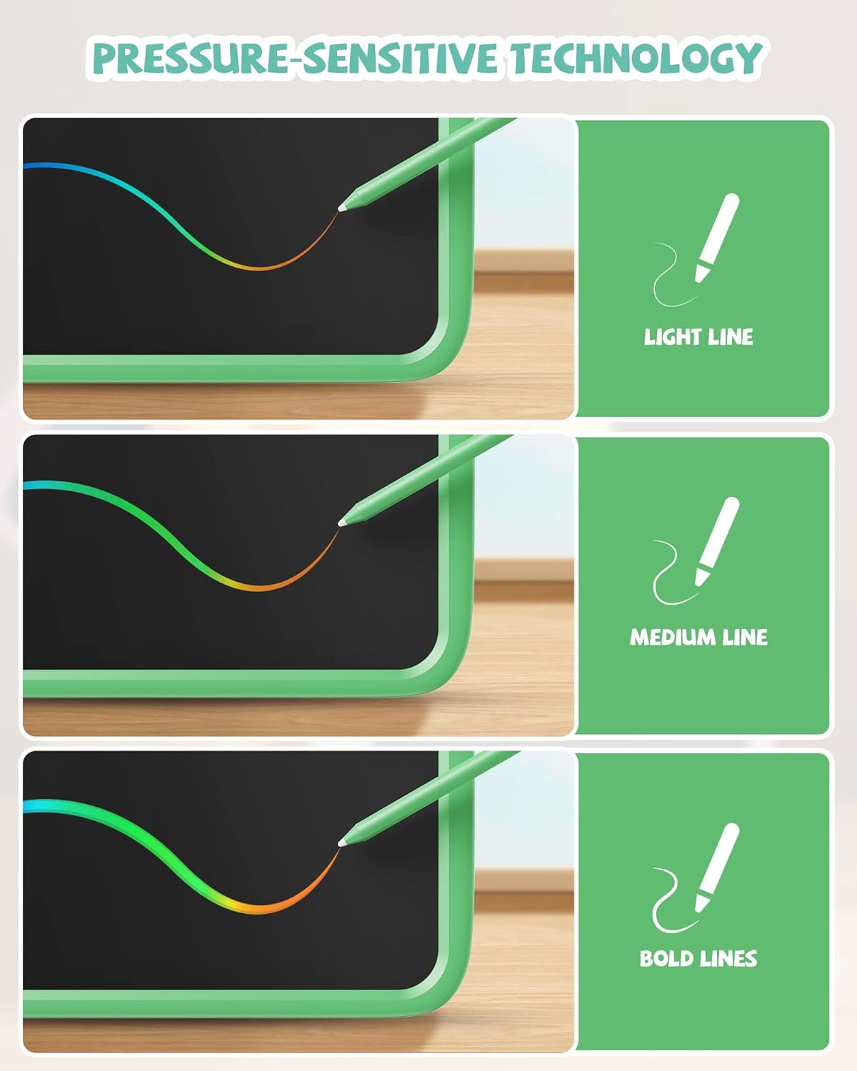 - 🌈Kids Educational Toys&Easy to use: This 10-inch writing tablet is a perfect learning toy for kids 3 4 5 6 7 8 years old girls. It can be used for drawing, doodling, writing, counting and so. much more! Perfect for leaving messages for family, shopping lists, to-do lists, recipes, and even office Memos. Cleanup is easy! Just press the convenient erase button and you or your child are ready for new drawings and messages! The Lock/Unlock feature prevents accidentally erasing your creations.