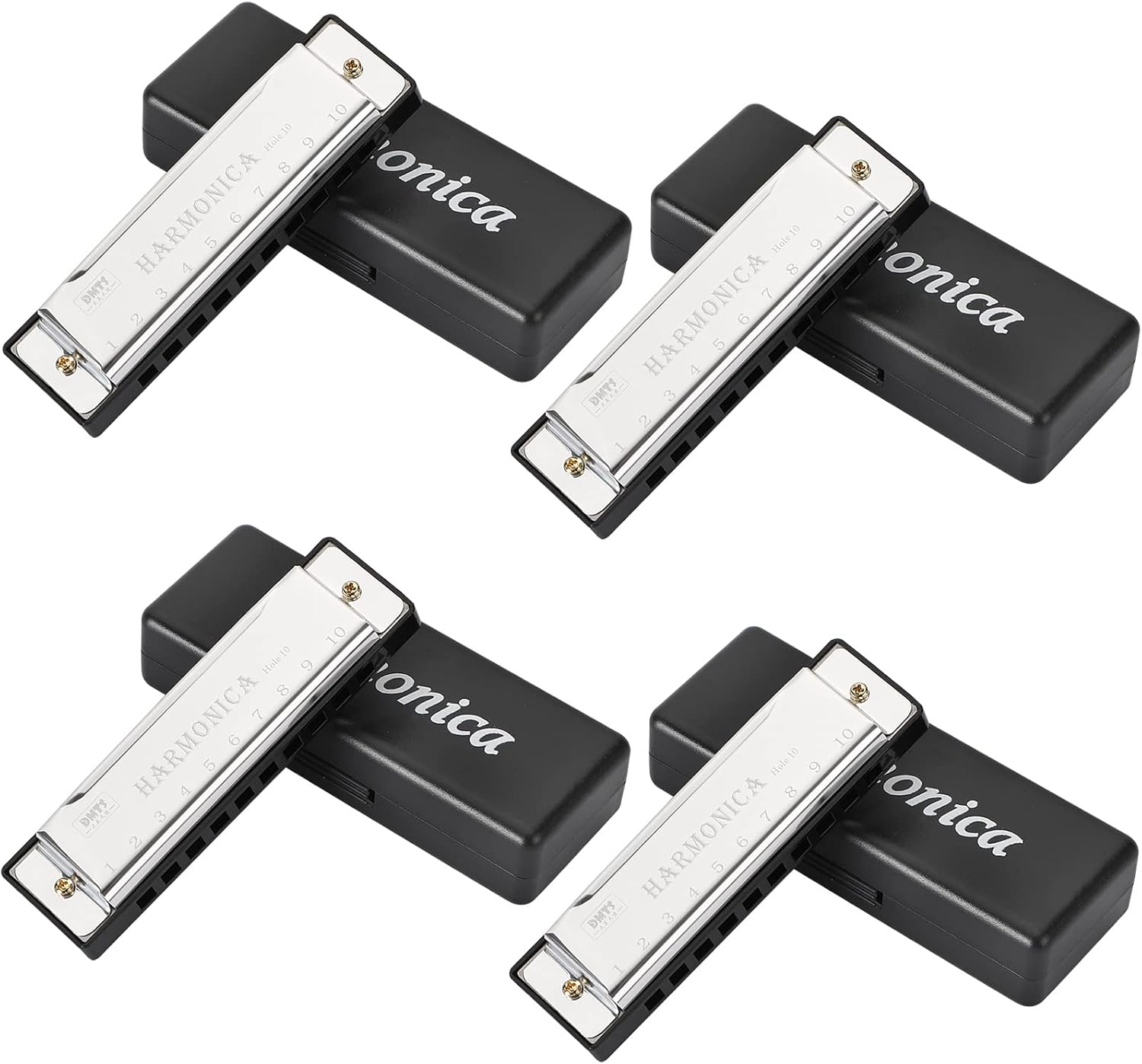 UPINS Harmonica, 4PCS Key of C 10 Hole 10 Tones Titanium Color Harmonica with Case for Beginner (Silvery)