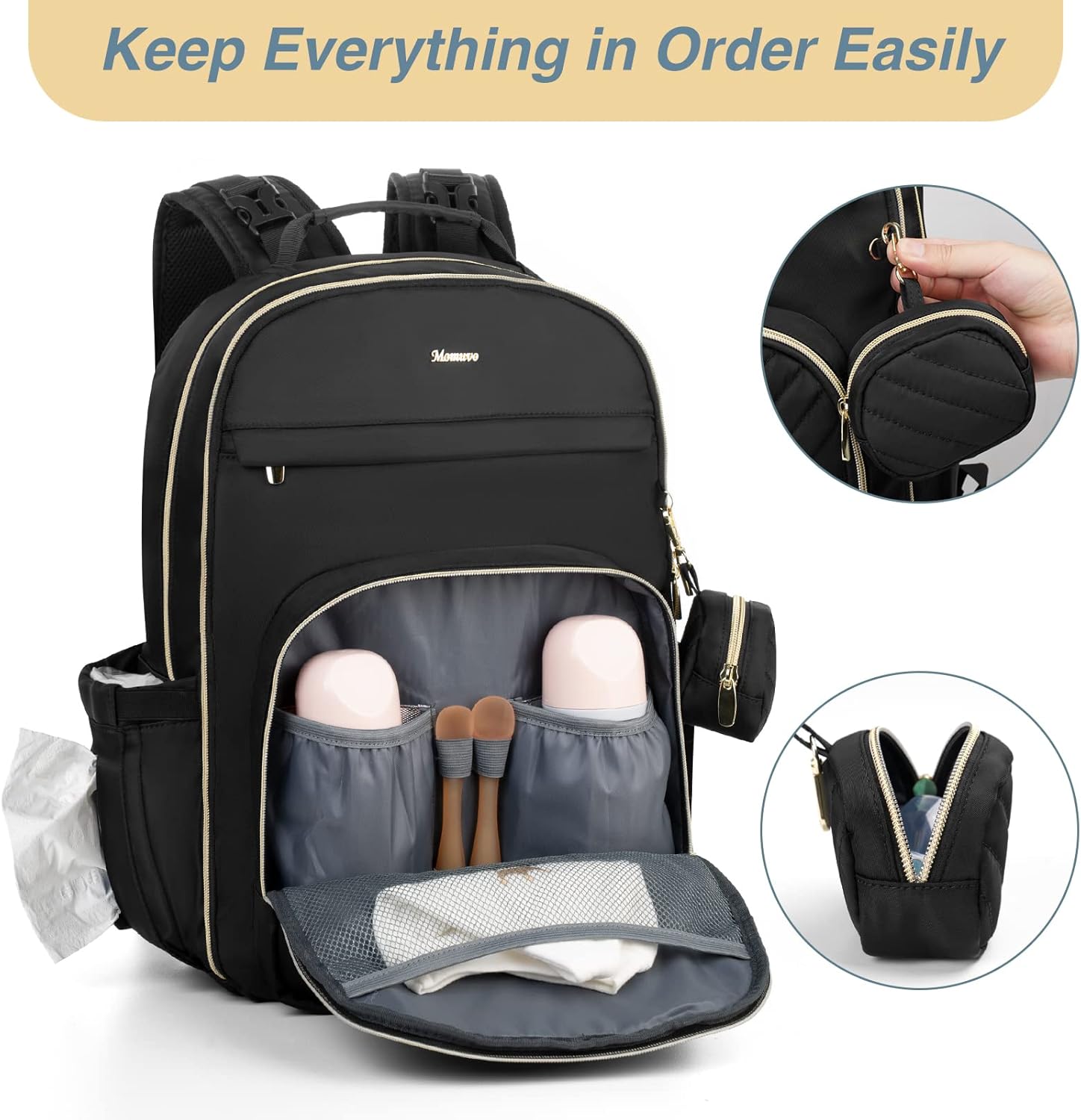 MOMUVO Diaper Bag Backpack, Quilted Baby Bag with Changing Pad & Stroller Straps & Pacifier Case, Large Travel Diaper Bags for Mom Dad, Black