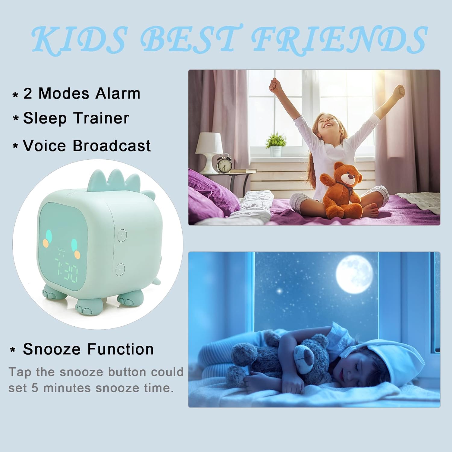 - [SLEEP TRAINING CLOCK]: The cute dinosaur-designed alarm clock uses environmentally friendly and safe silicone material, which feels soft and comfortable. The alarm clock with soft colorful lights,it is a must choice for training children to develop good sleeping habits.