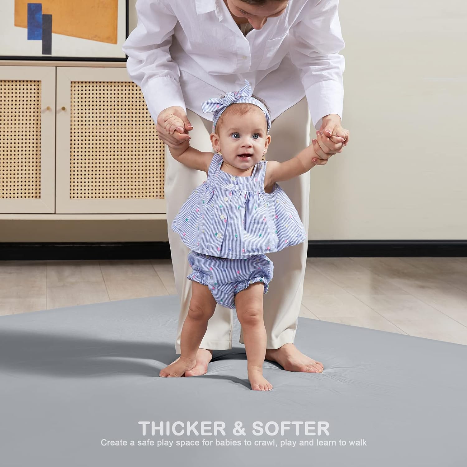 - THICKER & SOFTER - The baby play mat can be up to 1.18 inches thick when fully inflated, high-resilience foam filling provides extra comfort for your baby's crawling, rolling, sitting up & first steps.