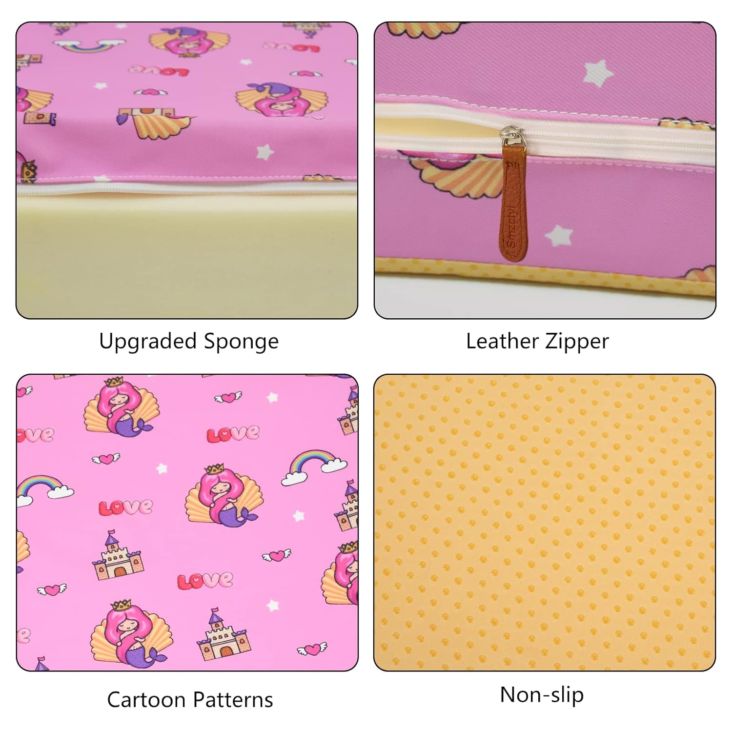 - ATTRACTIVE PATTERN: This toddler booster seat for dining table adopts an interesting animal pattern. The pink mermaid patterns are able to attract children's eyes, let them quickly like the booster cushion that can help them increase their height. The size of the booster cushion are 12.6 x 14.2 x 3.5 inches, which is suitable for most dining chairs.