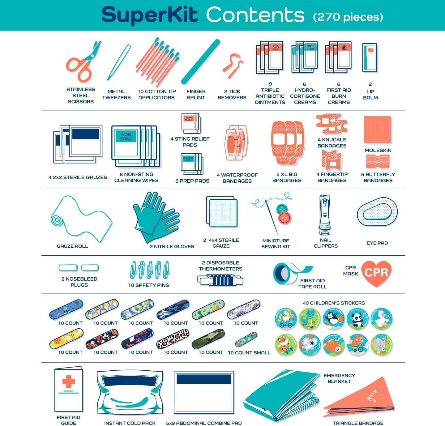 - All You Need – Good things come in complete packages! Your large first aid kit has 270 pieces of essential first aid supplies for every ouchie. From burn relief to bandages, you’ll be ready for anything.