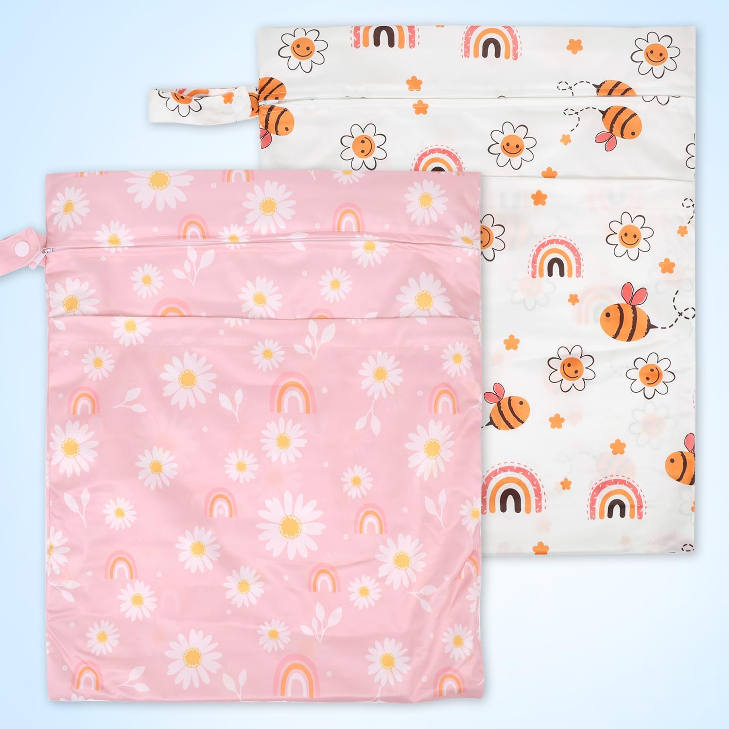 • 2 ZIPPERED POCKETS & HANDLE DESIGN: The 2 pack laundry bags are designed with 2 zippered compartments to keep wet and dry clothes separately, or separate dirty and clean diapers. Keep dry and clean. There's a handle with a button on one side for hanging up, convenient to carry and attach to your stroller, doorknob, towel rack, hook or handbag.