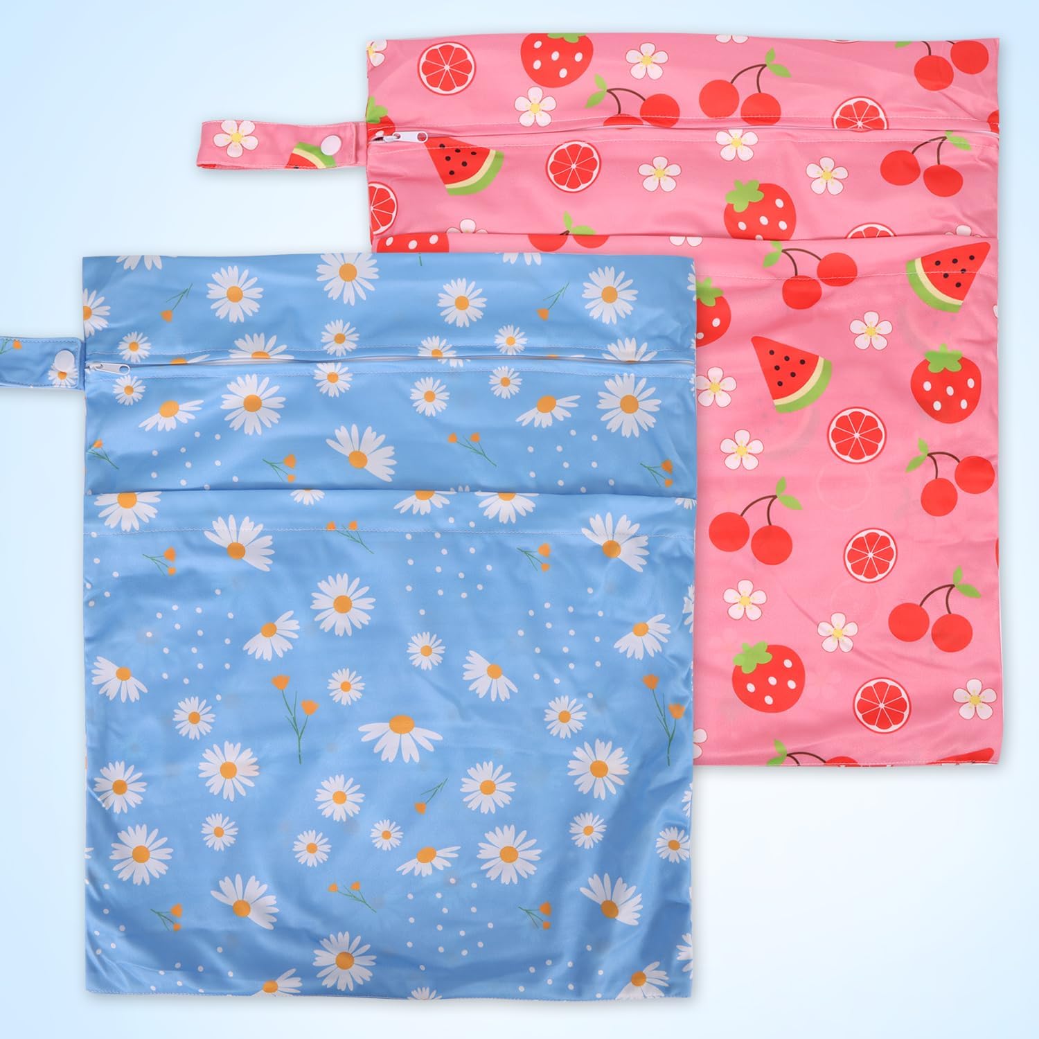 - 2 ZIPPERED POCKETS & HANDLE DESIGN: The 2 pack laundry bags are designed with 2 zippered compartments to keep wet and dry clothes separately, or separate dirty and clean diapers. Keep dry and clean. There's a handle with a button on one side for hanging up, convenient to carry and attach to your stroller, doorknob, towel rack, hook or handbag.