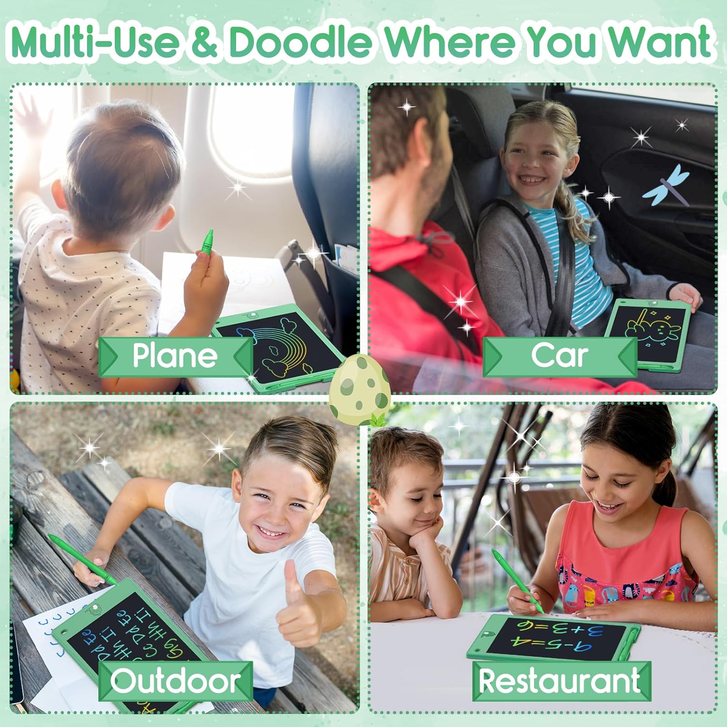 - [Eye Friendly, Safe & Durable & Portable Drawing Tablets]: Made with safe & non-toxic & durable material, ensure the health and safety of your children; LCD screen use it in the bright environmental to catch the line better, itβs NO radiation, NO glare, NO blue light, NO harm to eyesight, very safe and comfortable for your kids to write & draw long time! An ideal boys girls toys & gifts for back to school, birthday, Christmas, Thanksgiving Day, Easter etc.
