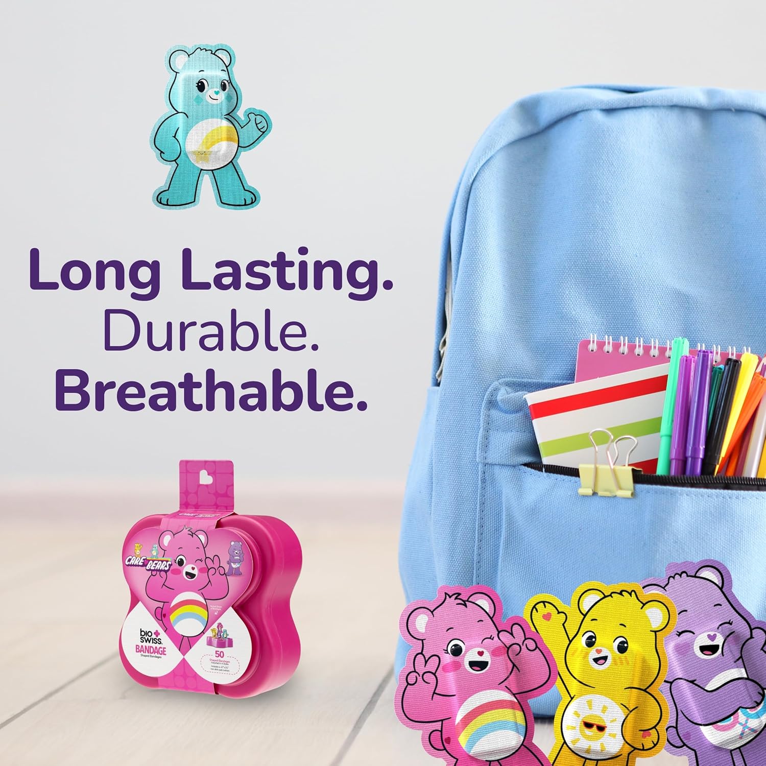 - CARE BEARS BANDAGES: This 50 piece pack of Care Bears bandages feature fun Wish Bear, Funshine Bear, Share Bear, and Cheer Bear shapes, and is great for putting a smile on kids' faces while protecting wounds such as cuts, scrapes, and burns; sticky bandages come in a cute plastic container and are perfect for kids and adults alike, and also for school nurses and pediatric doctors