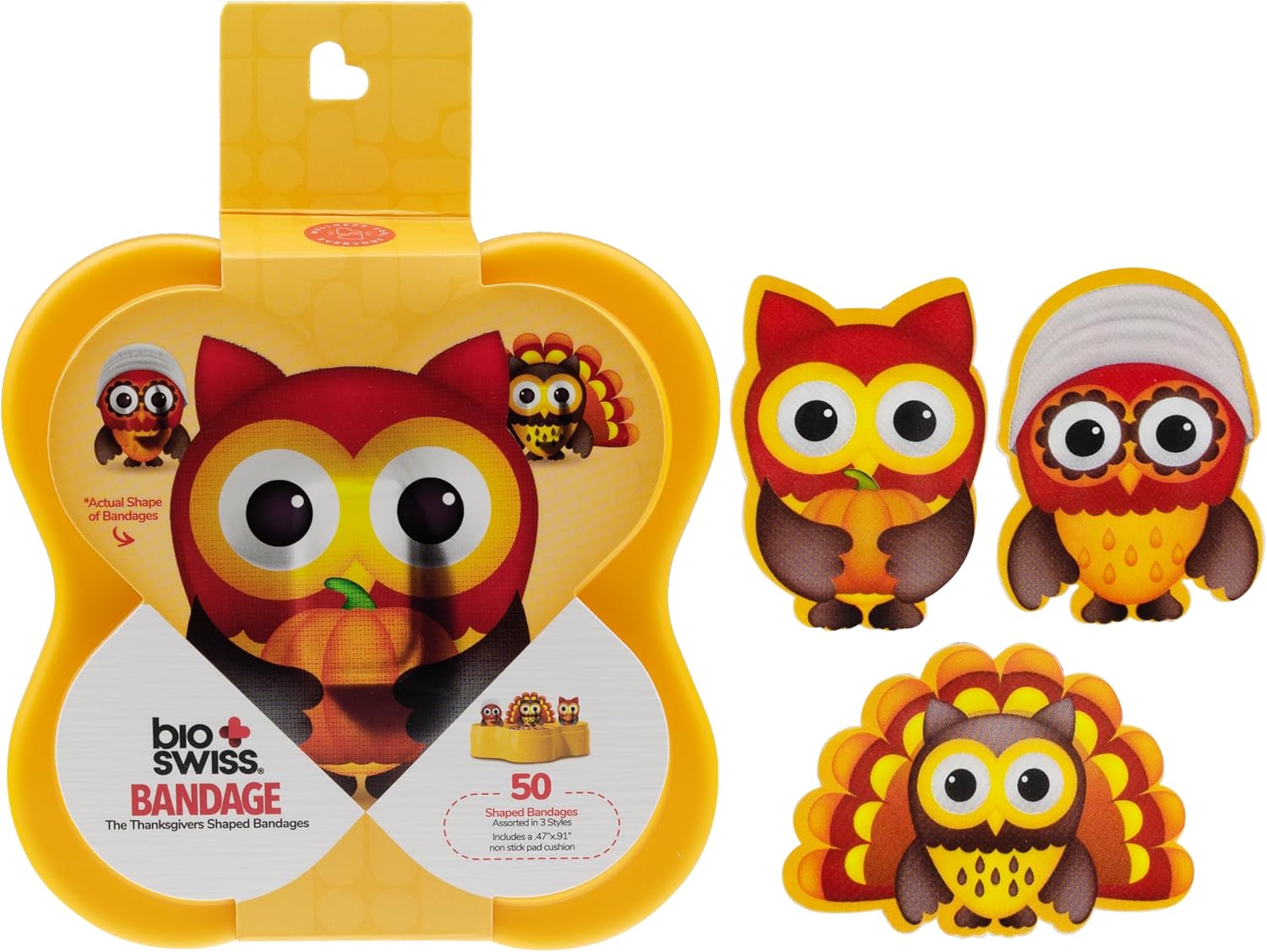 - THANKSGIVING BANDAGES: This 50 piece pack of Thanksgiving owl bandages feature fun Hope, Autumn, and Faith owl shapes, and is great for putting a smile on kids' faces while protecting wounds such as cuts, scrapes, and burns; sticky bandages come in a cute plastic container and are perfect for kids and adults alike, and also for school nurses and pediatric doctors