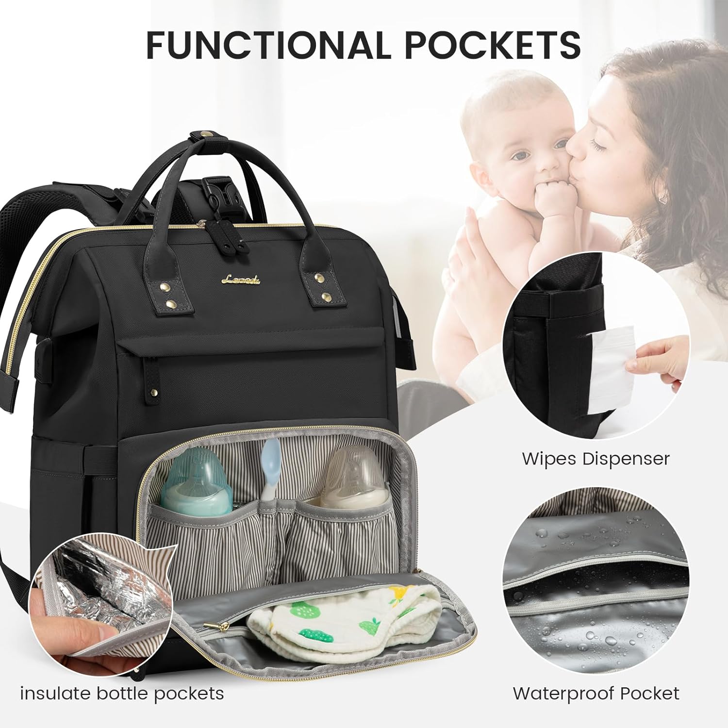 LOVEVOOK Diaper Bag Backpack, Baby Bag with Changing Station, Large Diaper Backpack for Moms Dads, Waterproof Leather Accents Baby Boy and Girl Bag for Travel Baby Essentials, Black