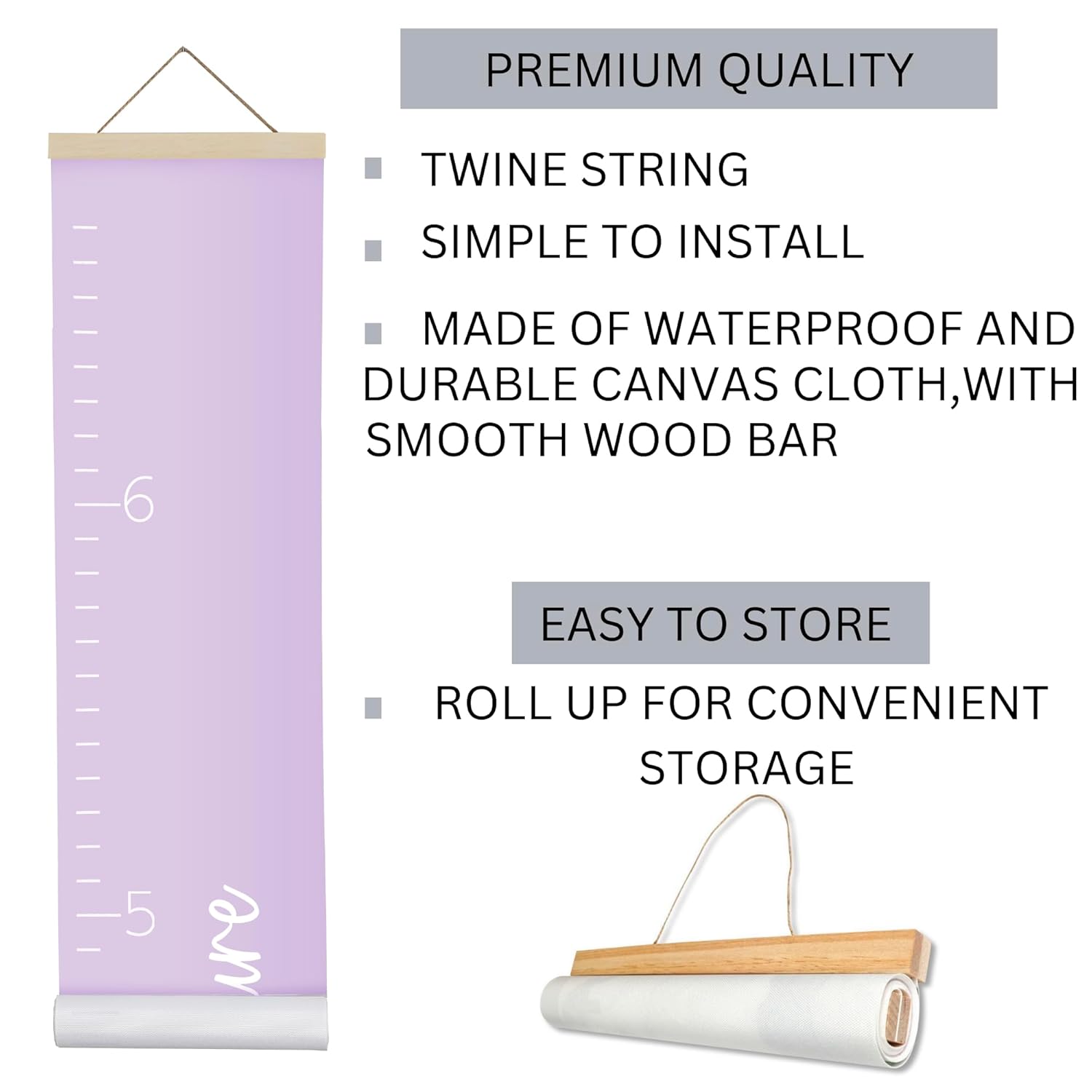 - SIMPLE TO INSTALL: Hang it with a sturdy string attached 5.5" off the ground to ensure accuracy; This lightweight baby growth chart for wall is removable, portable and rollable so it can be easily stored for safekeeping, future admiration and conversation topics for years to come