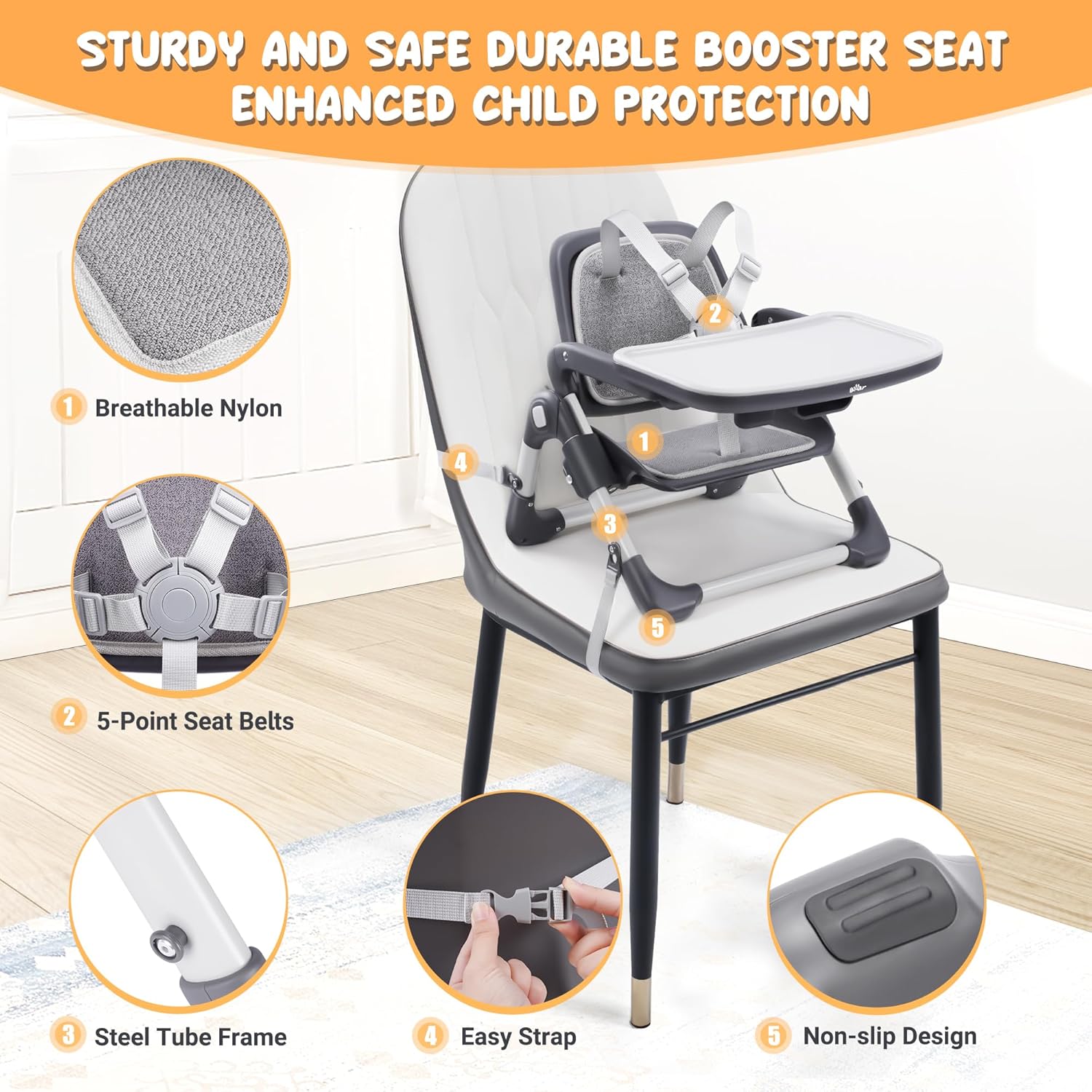 - Safe & Secure: Featuring a five-point harness, this booster seat keeps your baby safely in place, preventing slips. Non-slip feet enhance stability on adult chairs, while the skin-friendly, BPA-free cushion ensures comfort and safety during meals or snacks