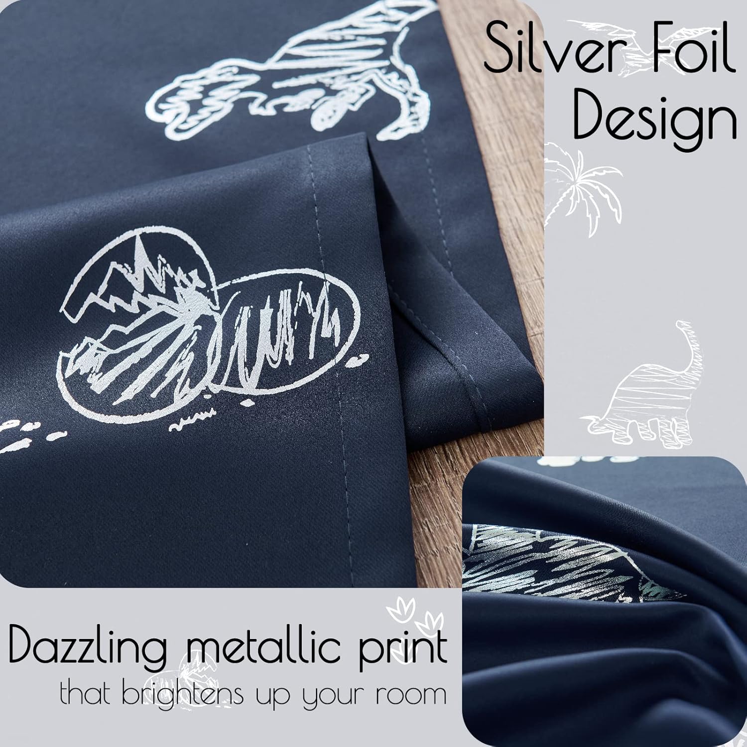 - Dinosaur Foil Printed Curtains: With these two panels 52" wide x 63" long of cute Dino Foil Printed Curtains that will add charm and whimsy to your little ones' room, guest room, or any space that needs a touch of magic