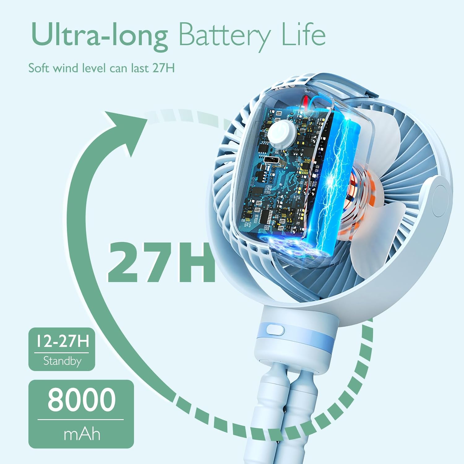 Momcozy Portable Stroller Fan, 8000mAh, 27H Ultra-long Battery Life, Detachable 4 Speed 360°Rotate, LED Night Light with 2 Modes, USB Rechargeable Handheld Cooling Fan for Travel, Car Seat, Bedroom
