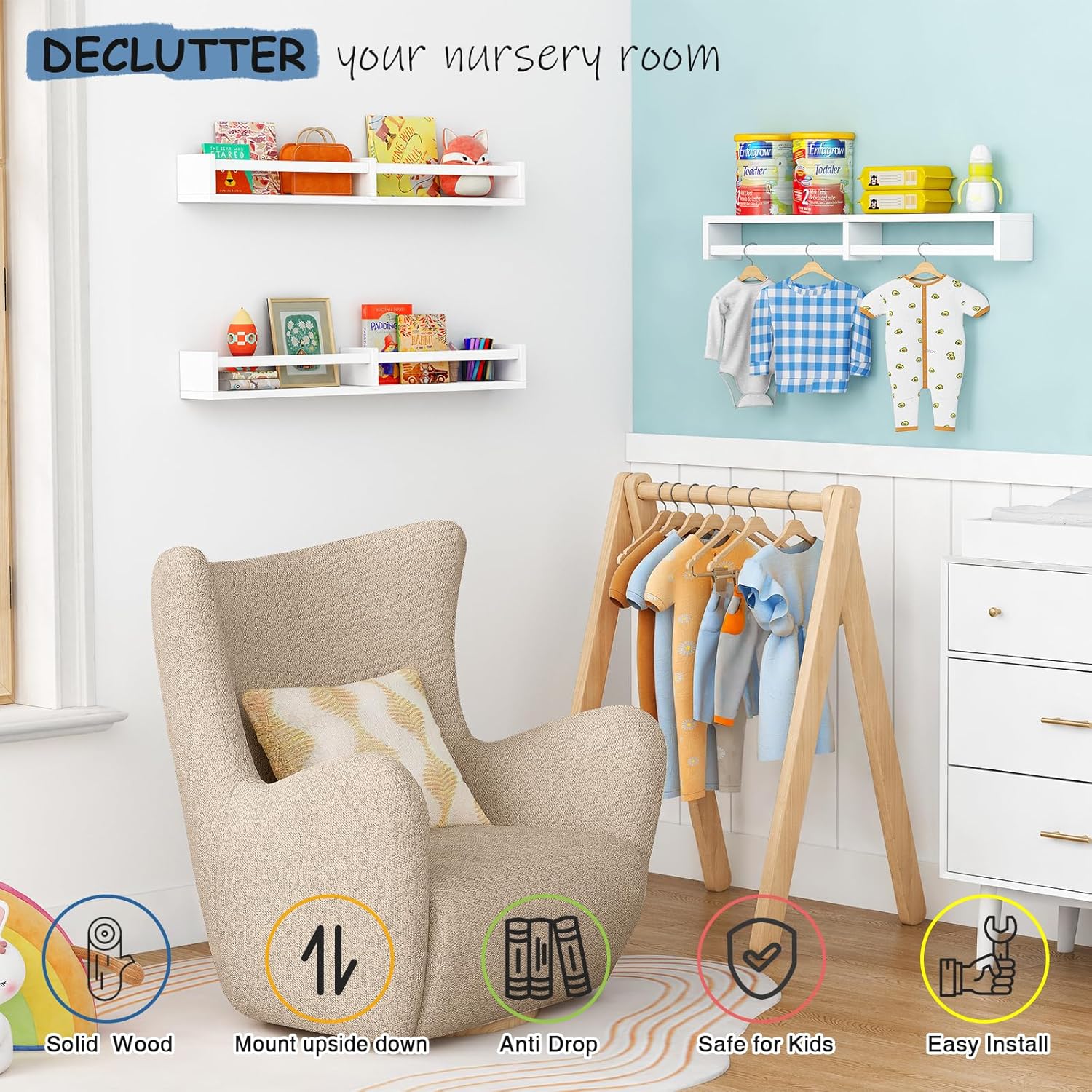 - [Versatile & Multifunctional] The Harwaya large nursery shelves are no limit to creativity! Place them as nursery book shelves in the kids room, cosmetic organizer shelf in the bathroom, spice rack shelf in the kitchen. Mount them upside down as nursery clothes shelves in kids room or nursery. Theyβre going to fit any space and any style thanks to their essential design and to their classic white color.