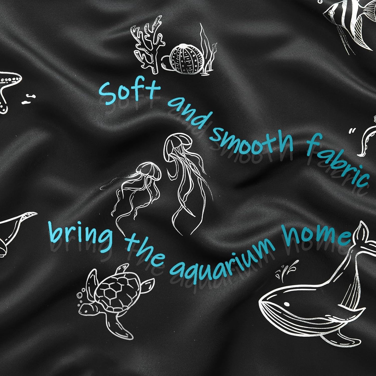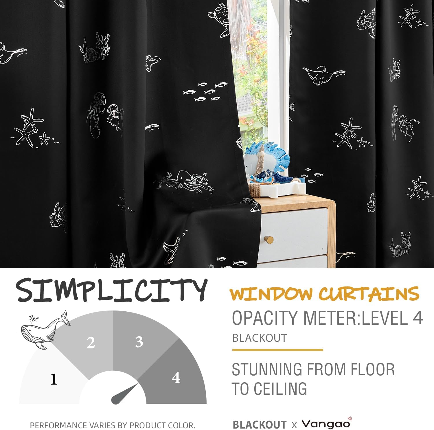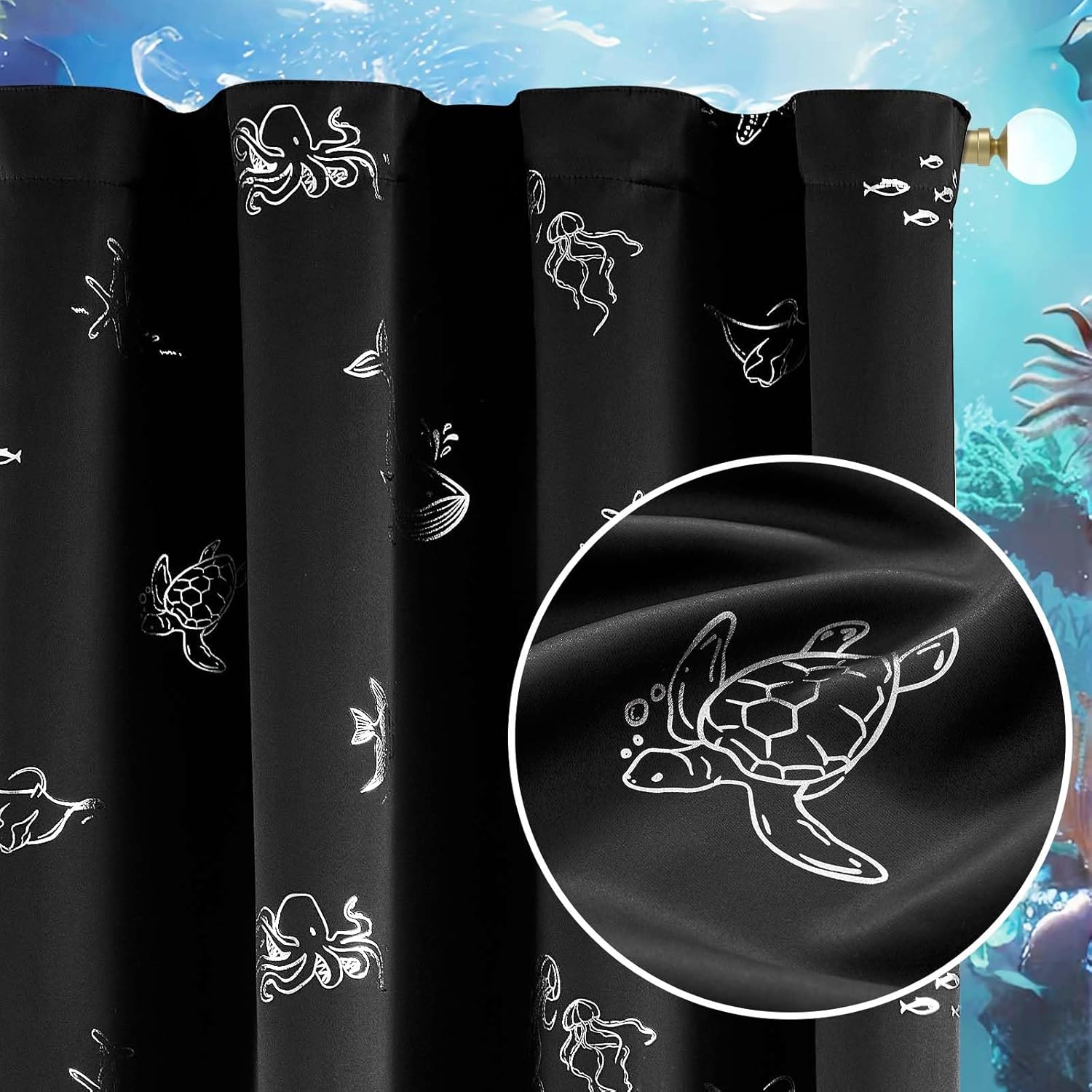 Vangao Kids Curtains for Boys Bedroom Kids Blackout Curtains 84 Inch Length Ocean Aquarium Nursery Drapes for Girls Bedroom Silver Sea Animals Print Thermal Insulated Drapes, Black 2 Panels