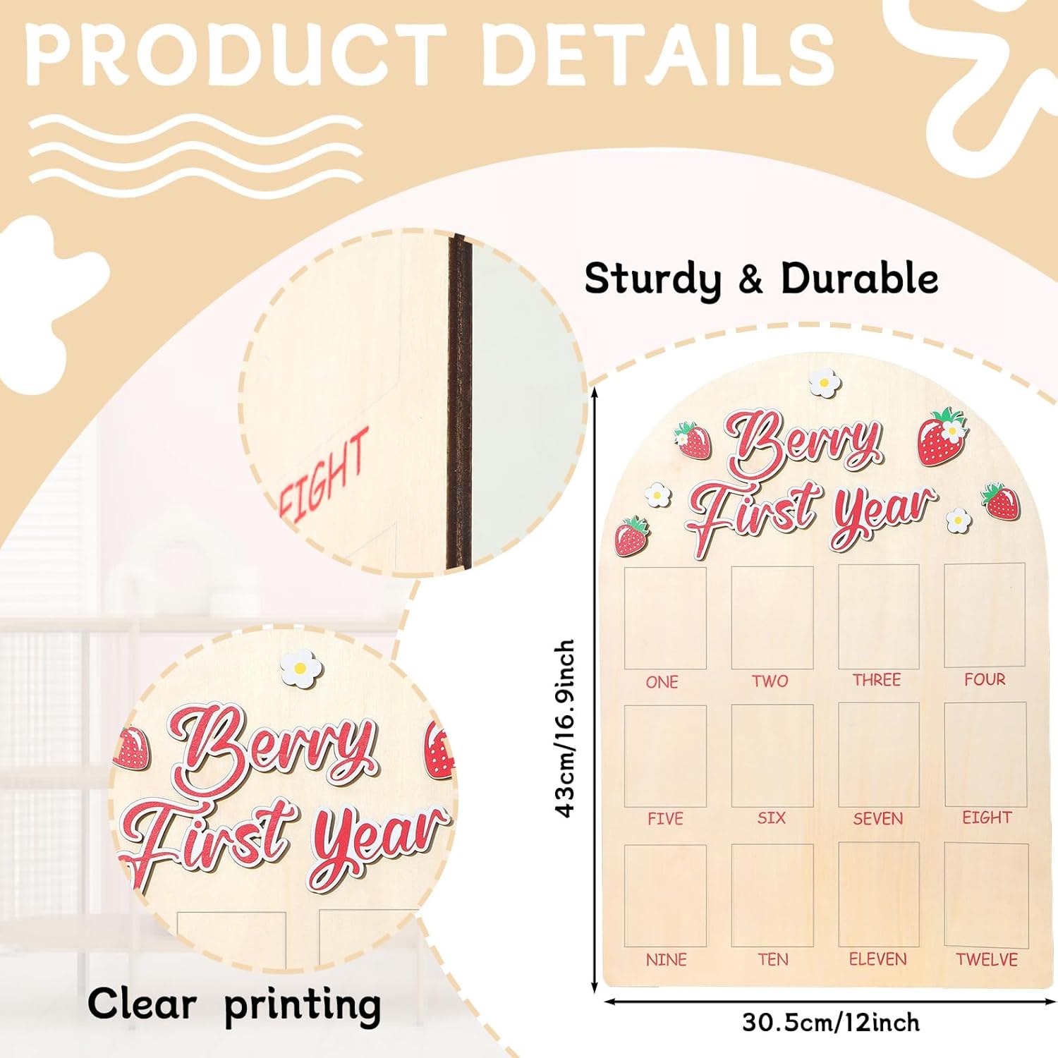 - Package includes: You’ll get 1pc of berry first year photo board measuring 16.9 x 12 x 0.2inches, suitable for 2 x 2.8 inches photos. Our strawberry birthday wooden board is the ideal keepsake to capture your baby's first year. This 12 monthly milestone picture frame is ideal for displaying cherished photos from each month, creating a beautiful memory of your child's growth and milestones.