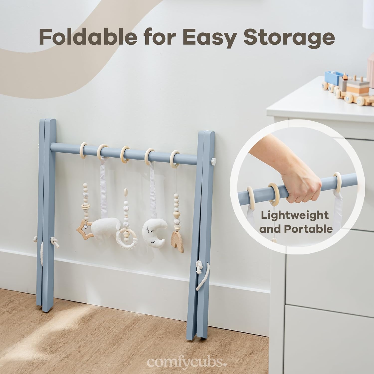 - Montessori Play Gym for Toddlers: Comfy Cubs wooden baby gym includes 5 adorable hanging toys in white and wood tones, designed to stimulate your baby’s visual and tactile senses. Helps develop hand-eye coordination and strengthens fine motor skills from an early age.