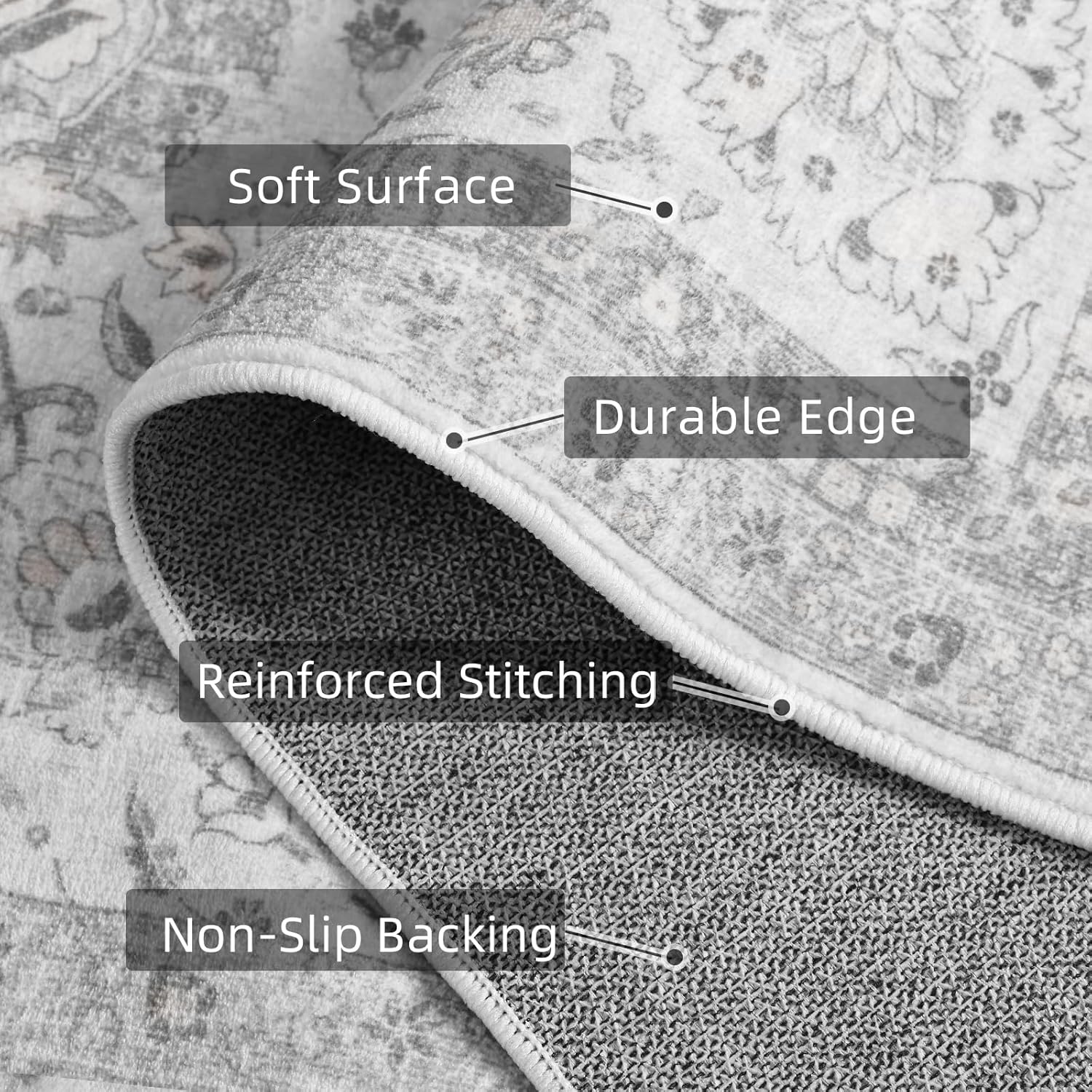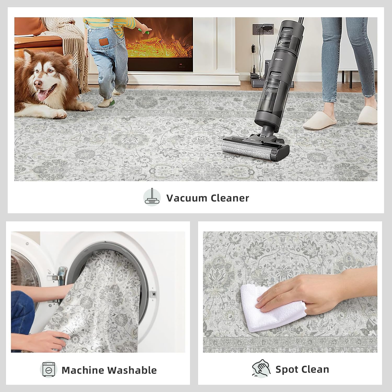 Neutral Area Rugs 8x10 for Living Room Vintage Rug Boho Floral Modern Washable Area Rug with Non-Slip Backing Large Carpet for Bedroom Dining Room Light Grey