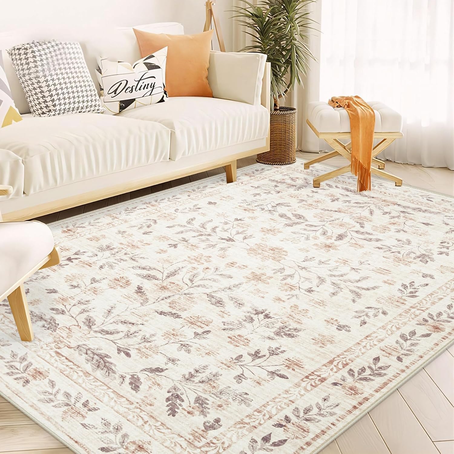 Rugs for Living Room 6x9 Rug, Washable Floral Boho Area Rug Non Slip Soft Low Pile Large Rugs for Bedroom Girls, Dining Room, Office, Kids Playroom(6'x9', Floral Beige)