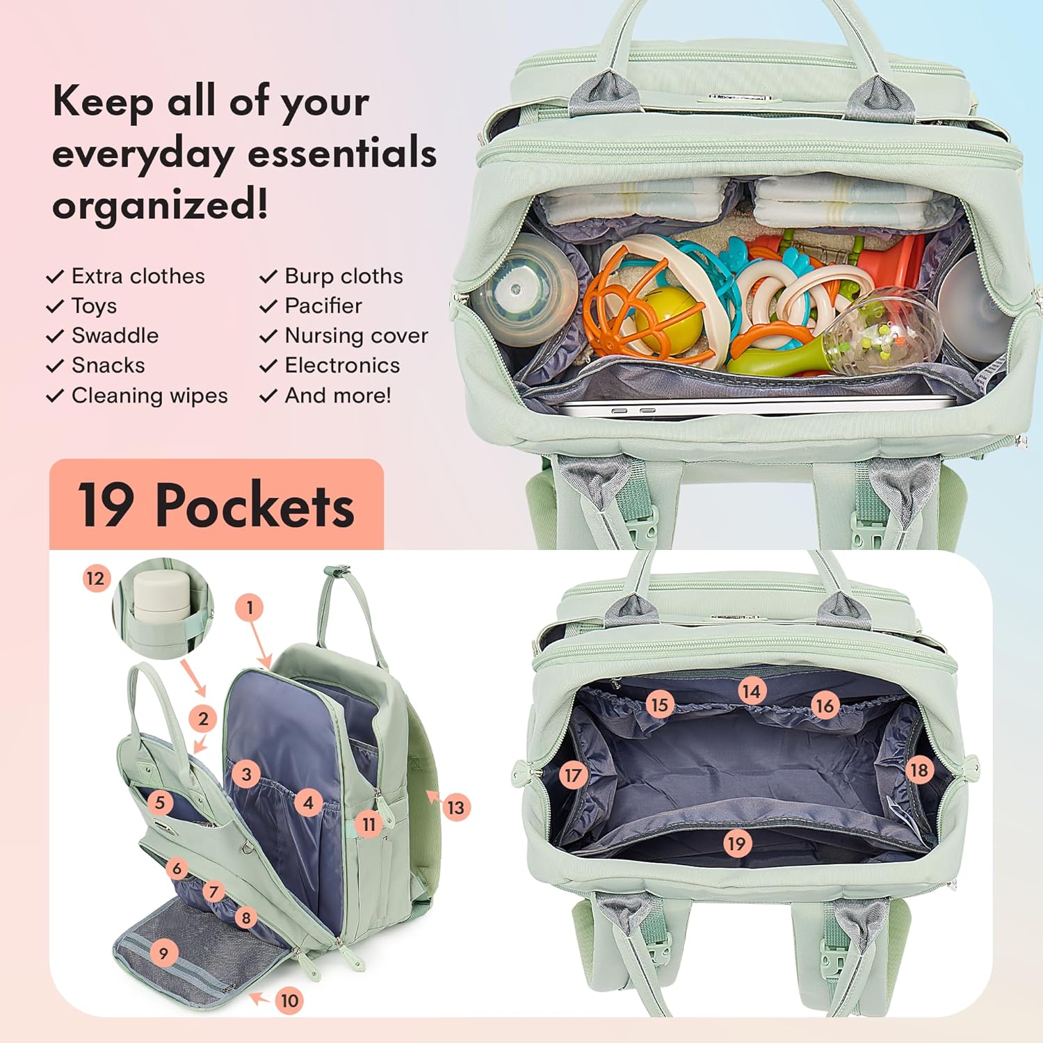 - All-in-One Design: A large capacity diaper backpack (size: 16.5'' x 8'' x 12'') with a portable changing pad, stroller straps, a pacifier case, a zipper wipe pocket, a key loop, and 5 insulated pockets. Lots of pockets (1 big compartment and 18 pockets) in all the right places. It’s a cinch to pack, grab and go.