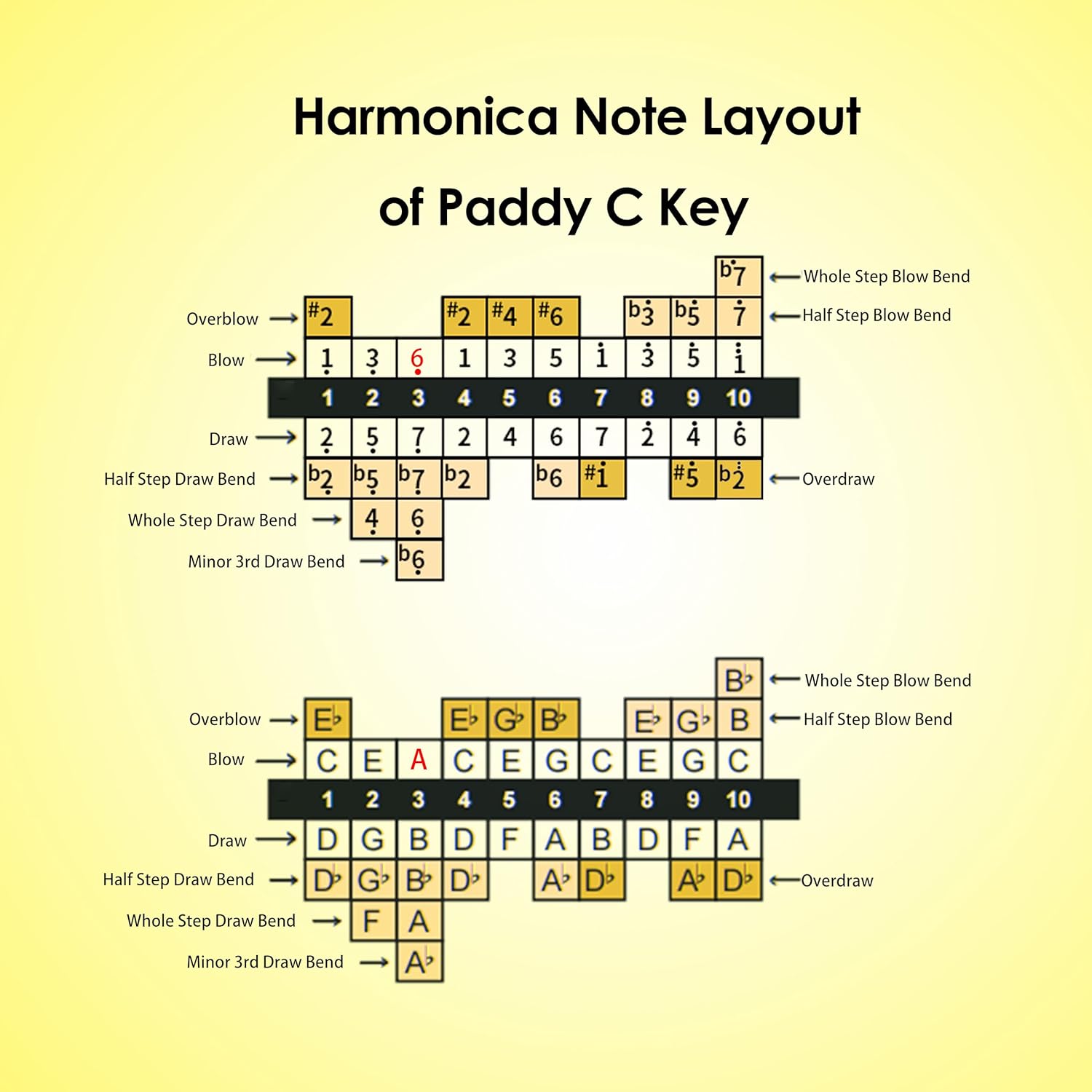 - Harmonica in Paddy Tuning: features 10 holes with reeds tuned to the key of C. A raised low A note on the 3rd blow allows for smooth melodic play without bending. This beginner-friendly design is ideal for folk and traditional music, offering ease of use and rich musical expression