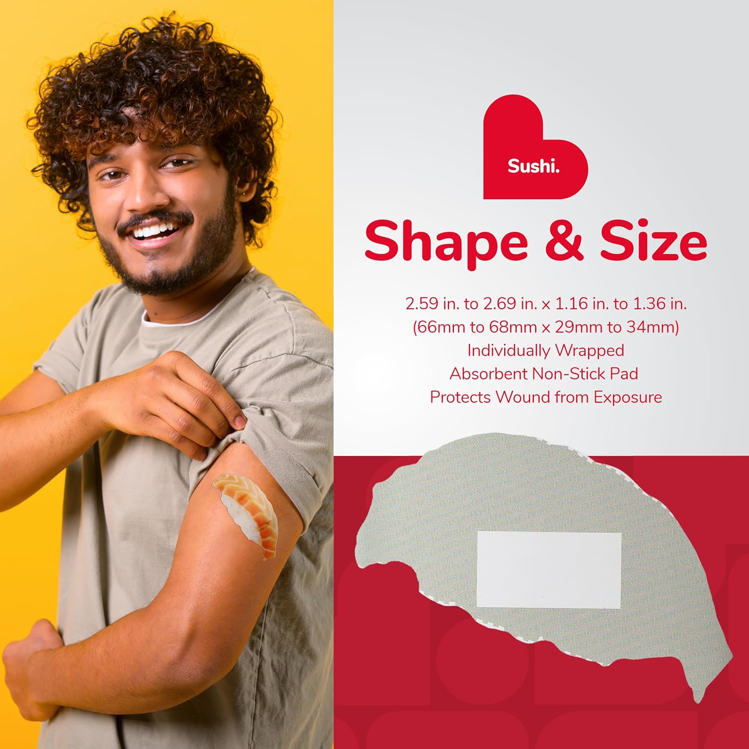 - SUSHI BANDAGES: This 24 piece pack of Sushi shaped bandages features 3 fun sushi shapes, and is great for putting a smile on kids' faces while protecting wounds such as cuts, scrapes, and burns; sticky bandages come in a cute cardboard box and are perfect for kids and adults alike, and also for school nurses and pediatric doctors
