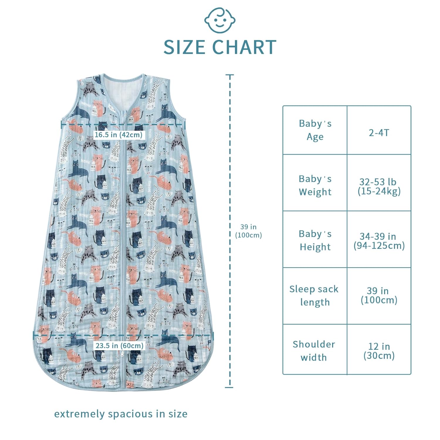 Baby Sleep Sack 2-4 T Baby Wearable Blanket 100% Organic Cotton 0.5 TOG Toddler Sleep Sacks 2- Way Zipper Soft 4 Layers 2T 3T 4T Kitten