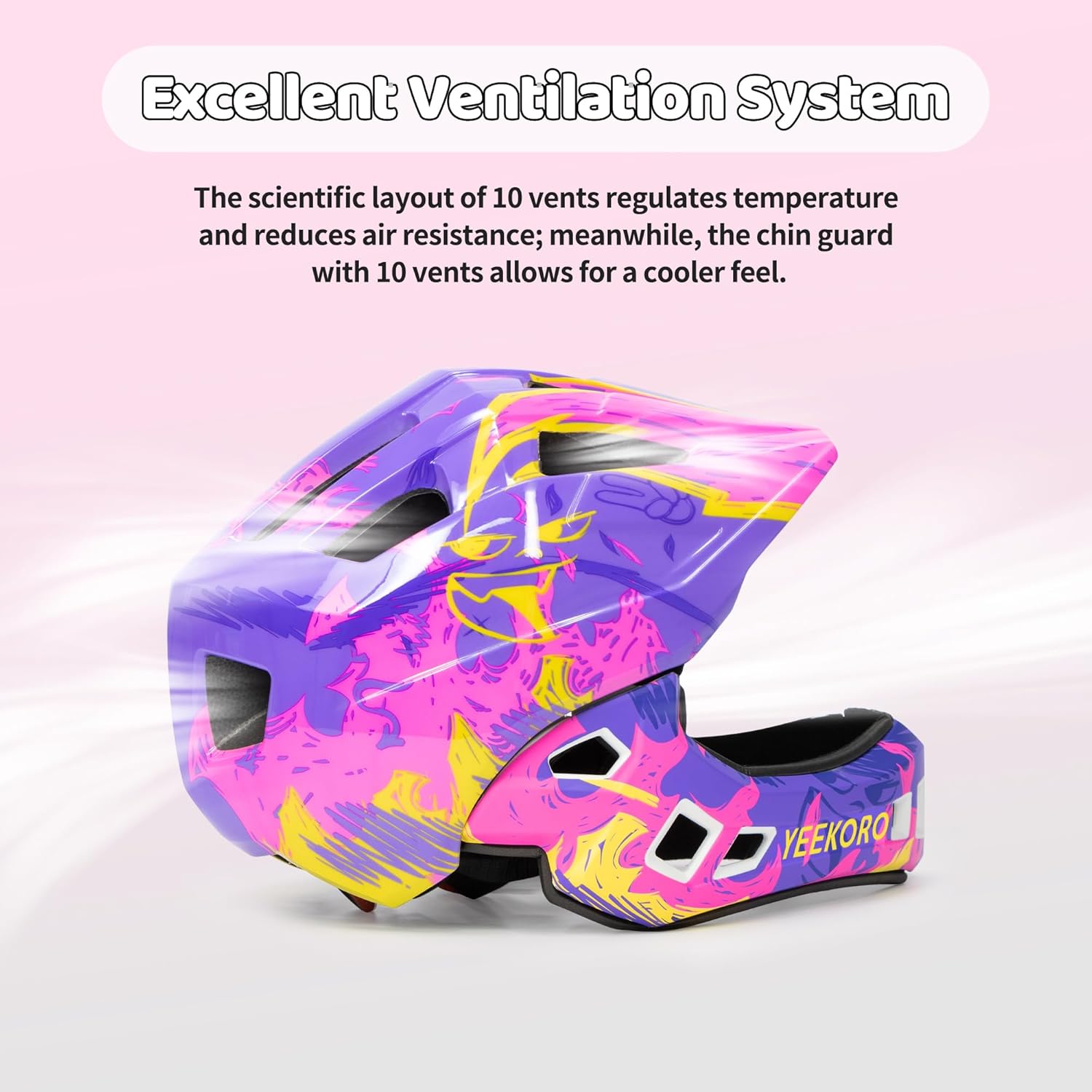 - FULL FACE PROTECTION SYSTEM: YEEKORO children's full face bike helmet is a unique blend of hard ABS shell and advanced EPS crash-proof material, with well-designed chin protection, which together builds a multiple defense system. Whether riding off-road or on the highway, your child will be provided with comprehensive safety protection, effectively resisting injuries caused by strong impacts and guarding every moment of adventure