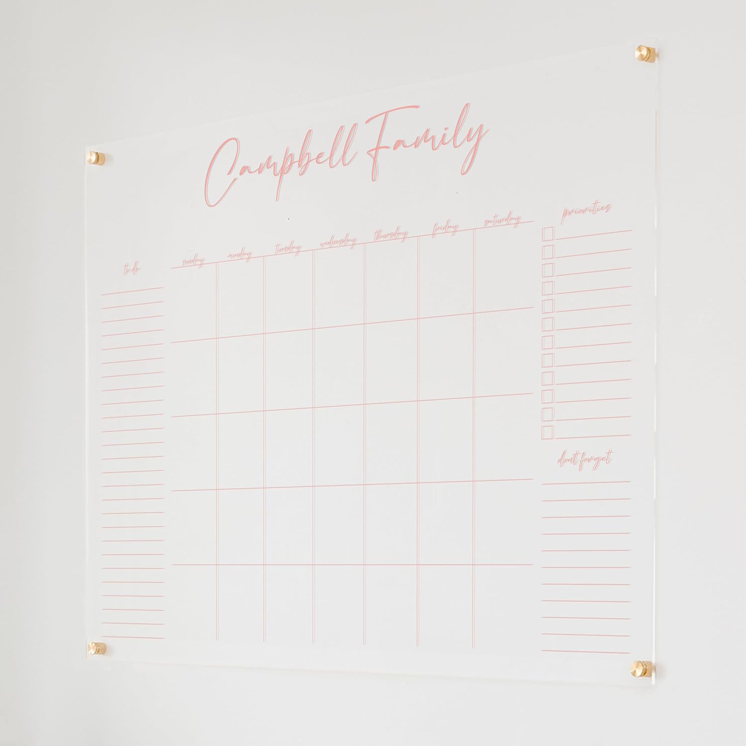 Personalized Clear Acrylic Calendar for Wall, Calendar Whiteboard for Wall, Dry Erase Wall Calendar, Wall Calendar Organizer System for Home (Cursive, Blush, 47.5"W x 36"H)