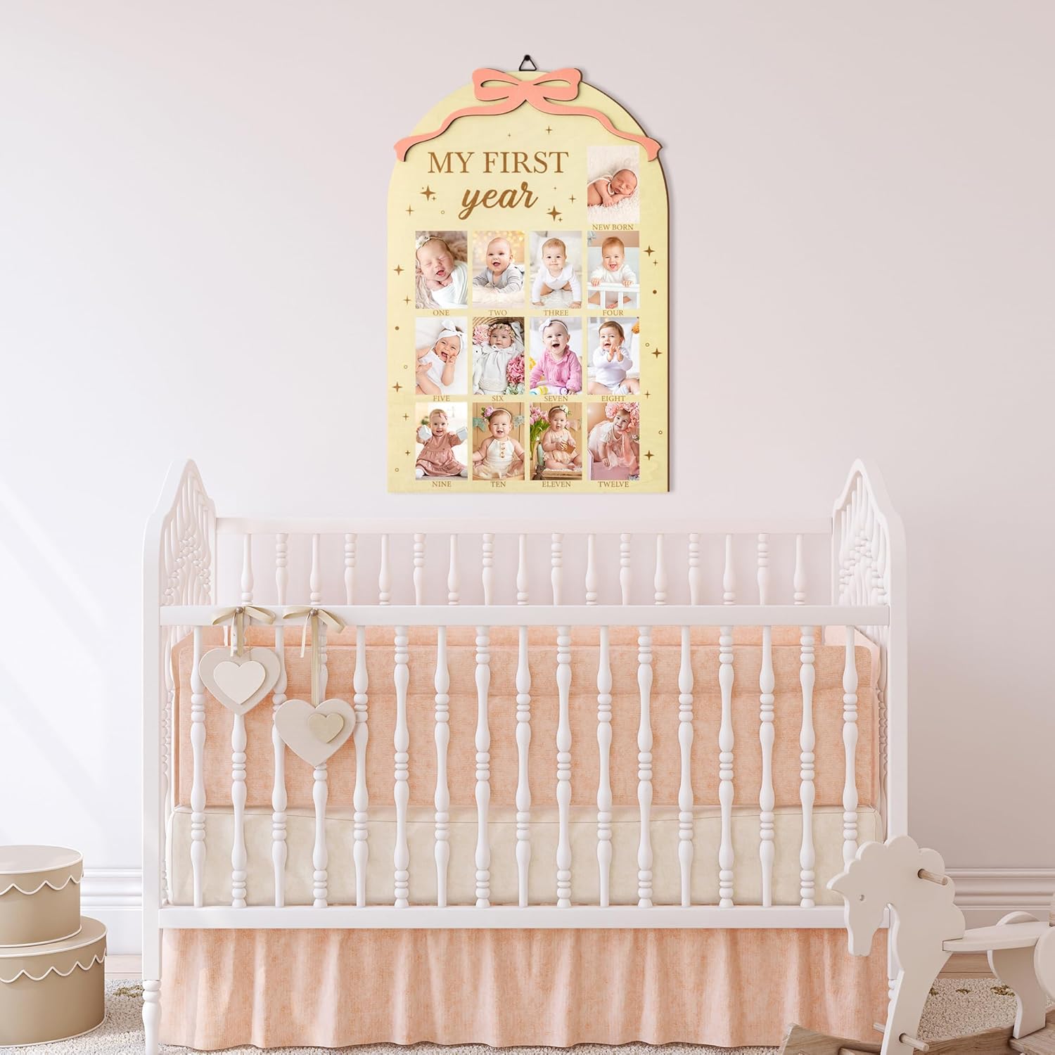 R HORSE My First Year Photo Frame Board, 3D Coquette Pink Bow Display Wood Board, Baby’s First Year 12 Months Milestone Sign 1st Birthday Frame Nursery Decor Keepsake Gift for Boy Girl