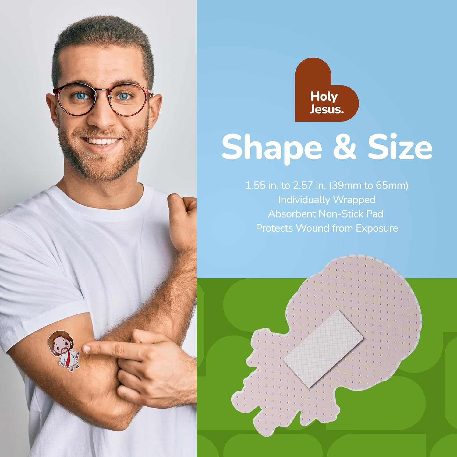 - HOLY JESUS BANDAGES: This 50 piece tin of Jesus shaped bandages is great for putting a smile on kids' faces while protecting wounds such as cuts, scrapes, and burns; sticky bandages come in a cute tin and are perfect for kids and adults alike, and also for school nurses and pediatric doctors