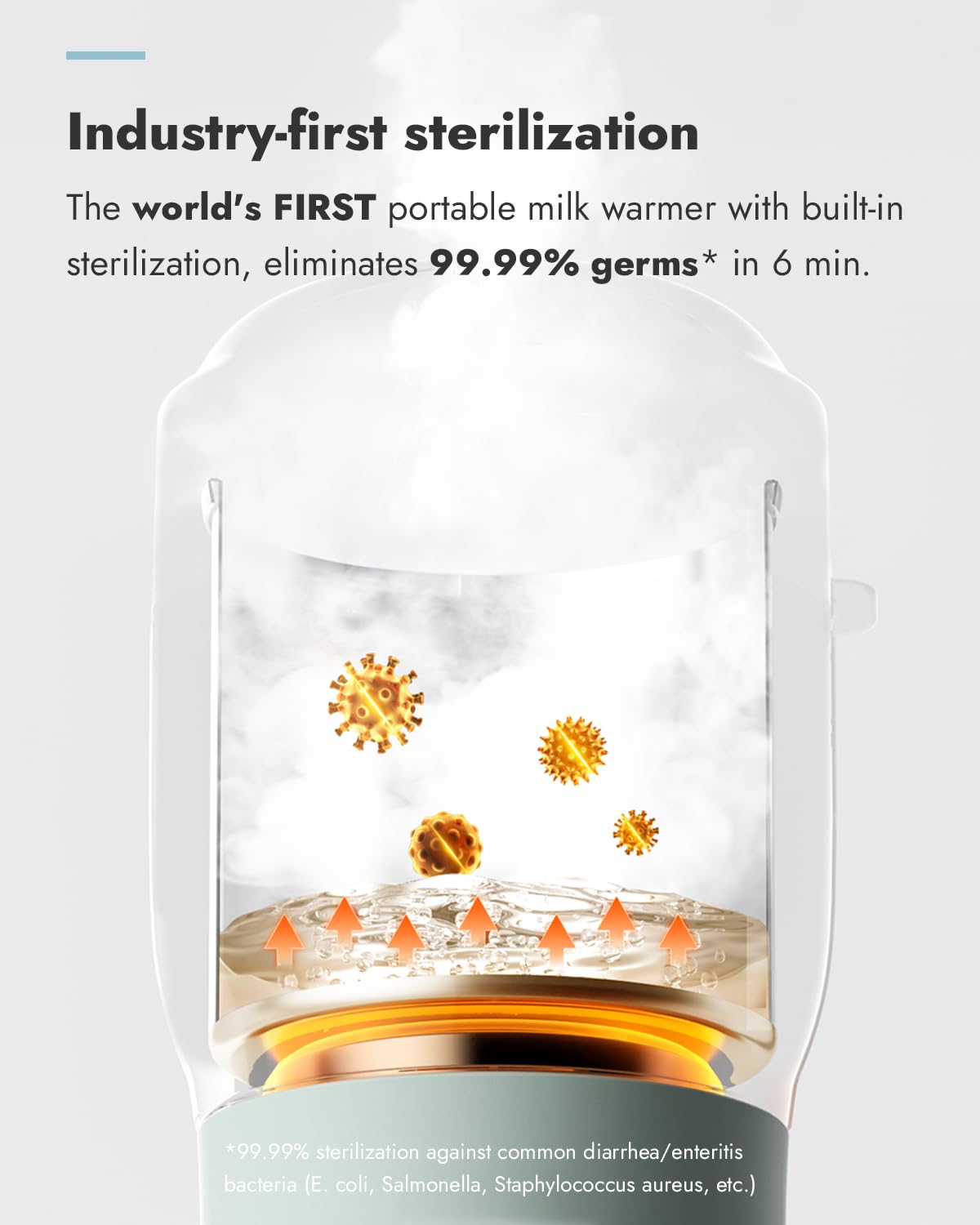 - Built-in Sterilizer & Safe Materials: The world's FIRST portable milk warmer with built-in sterilizer, helps maintain hygiene without extra tools. The warming chamber is made of FDA-compliant food-grade stainless steel — safe for breastmilk/ formula.