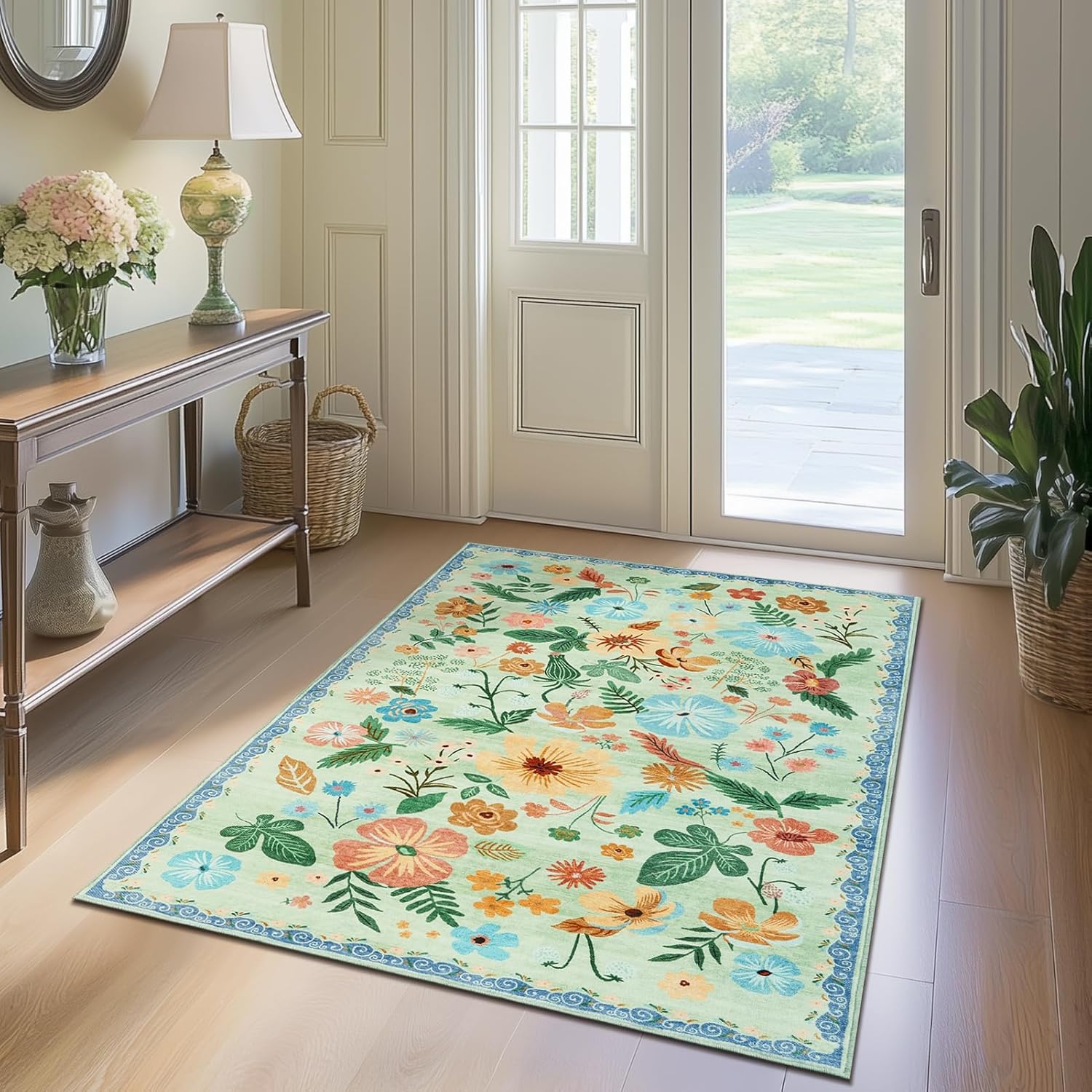 3x5 Rug for Living Room Washable Non Slip with Rubber Backing Soft Faux Fur Low Pile Stain Resistant Small Area Rug 3x5 Boho Vintage Floral Carpet Rug for Bedroom Kitchen Entrance,Green