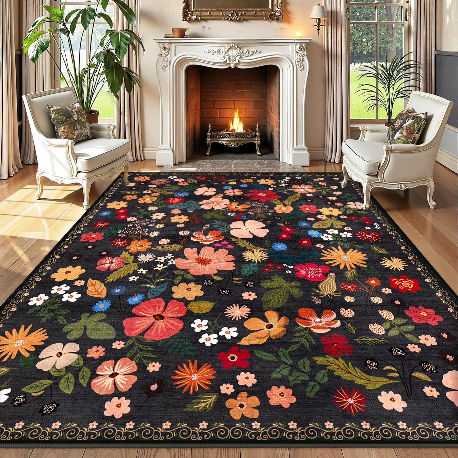 6x9 Living Room Rug Machine Washable Soft Faux Fur Low Pile Vintage Floral Modern Carpet Rugs Boho Non Slip Sound Absorbing Big Area Rugs for Bedroom Office Patio Dining Room Nursery Kids Room,Black