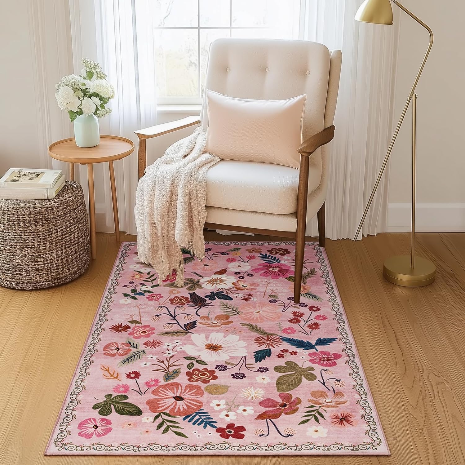 Pink Rugs for Bedroom Girls Machine Washable Area Rugs 3x5 Non Slip Low Pile Boho Floral Small Carpet for Nursery Living Room Bedroom Entryway Kids Playroom Office College Dorm Home Decor