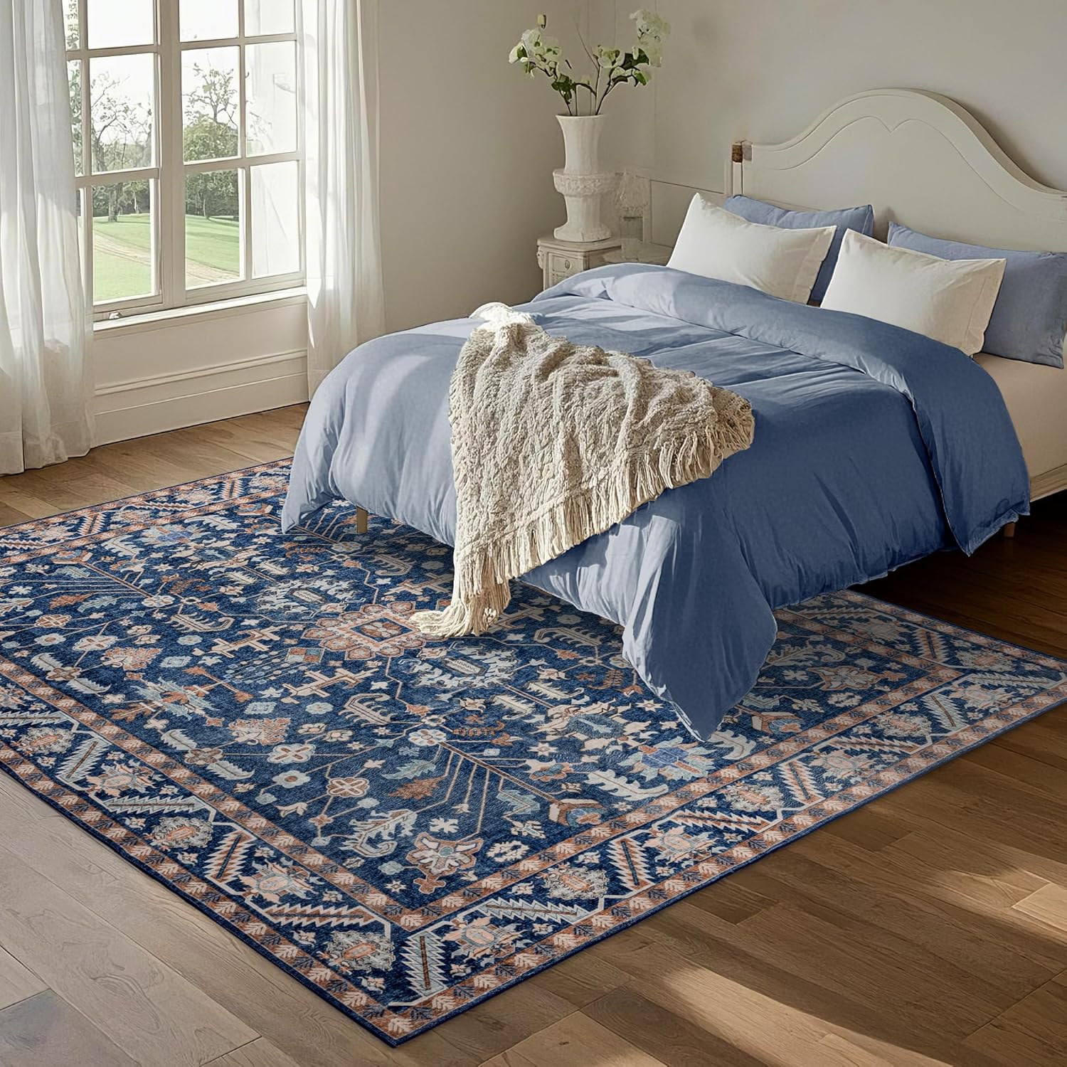 6x9 Area Rugs Washable: Oriental Soft Area Rug for Living Room Bedroom No Shedding - Low Pile Thin Carpet Rug for Dining Room Non Slip - Boho Vintage Rug for Home Decor - Navy Blue