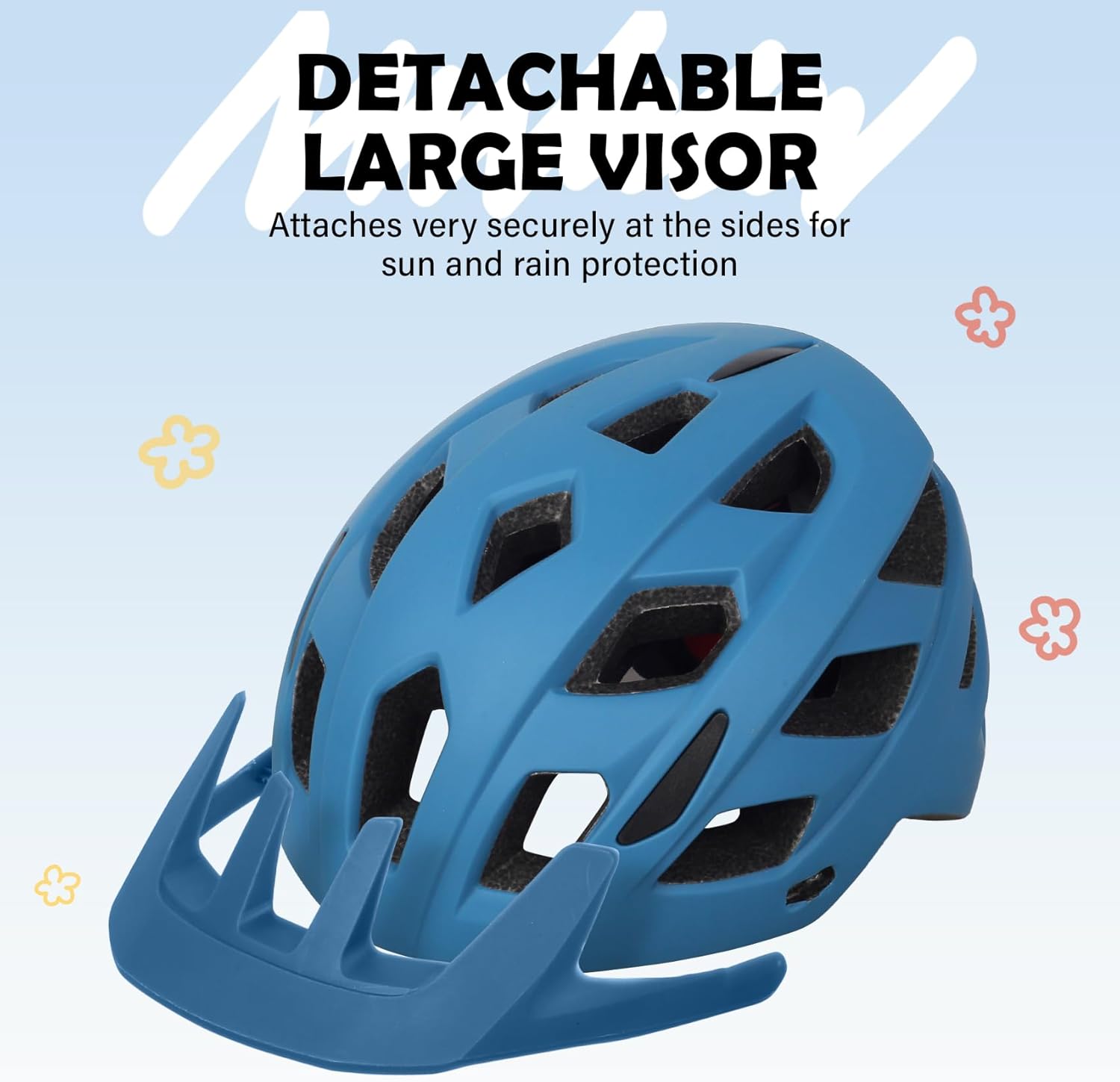 - Large Visor : The child bike helmet equipped with Snap-in detachable visor can better prevent sun and rain,it also keeping their face from scraping or hitting the ground when crash