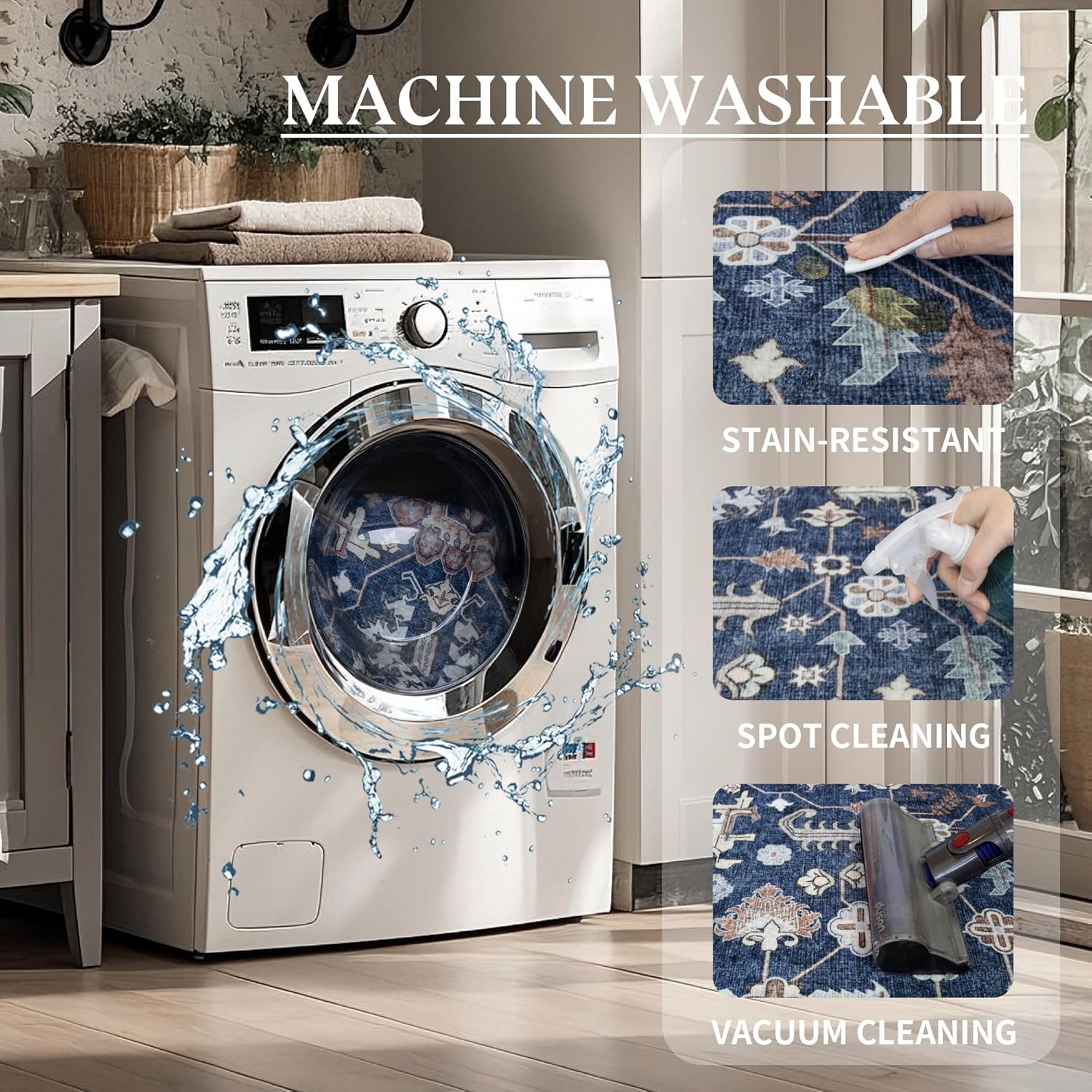 10x14 Area Rug Washable: Oriental Soft Area Rug for Living Room Bedroom No Shedding - Low Pile Thin Carpet Rug for Dining Room Non Slip - Boho Vintage Rug for Home Decor - Navy Blue